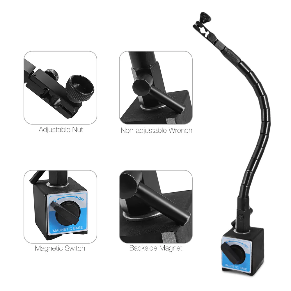 Основные функции: Регулируемая гайка делает этот держатель невероятно подходящим для стрелочного индикатора, стрелочного индикатора и так далее.Гибкие соединения позволяют регулировать направление и местоположение, что делает устройство более гибким.Удобный переключатель вкл./выкл. На его базе управляется высвобождением магнетизма, силой адсорбции основания до 1000 Н.Конструкция v-образного рифленого основания предназначена для безопасного крепления на цилиндрических поверхностями.С высокой стабильностью и тонкой регулировкой, это будет вашим идеальным измерительным инструментом в области точных деталей.Полезный совет:Обратите внимание, что индикатор циферблата не входит в комплект.