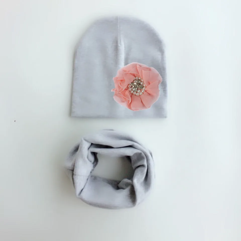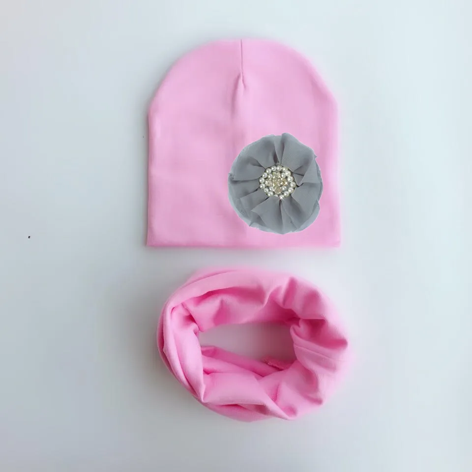 Набор из шарфа и воротника с цветком для девочек 1-3 лет, хлопковая шапка с жемчугом и цветочным рисунком, шляпа детская шапочка