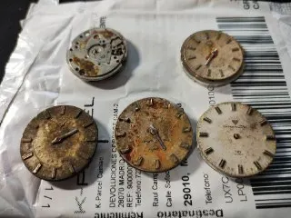 Все механические движения той же марки (разные модели, но очень похожие), они, кажется, из-за конца 70-х или начала 80-х годов. Практически все они приходят неполными, а некоторые с ржавыми деталями (особенно стебель или стебель, часть, где он вставляется, некоторые винты и некоторые отверстия снаружи), или при покупке нескольких вы можете получить функциональный движение с большим терпением, идеально подходит для практики и обучения. Рекомендуется хорошие отвертки и иметь ультразвуковую очиститель (много ржавчины и слизи в некоторых более выставленных частях).