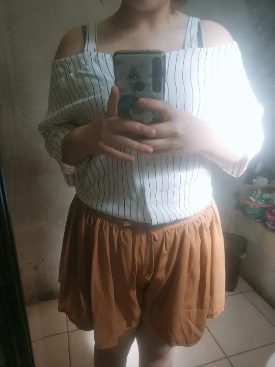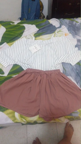 Очень хороший комплект! Смотрится хорошо, ткань приятная, удобен в носке. Немного просвечивает нижнее белье, но не критично. На параметры 155-55 брала S. Шорты сели идеально (возможно тем, кто повыше, будут коротковаты), блузка чуть-чуть большевата.