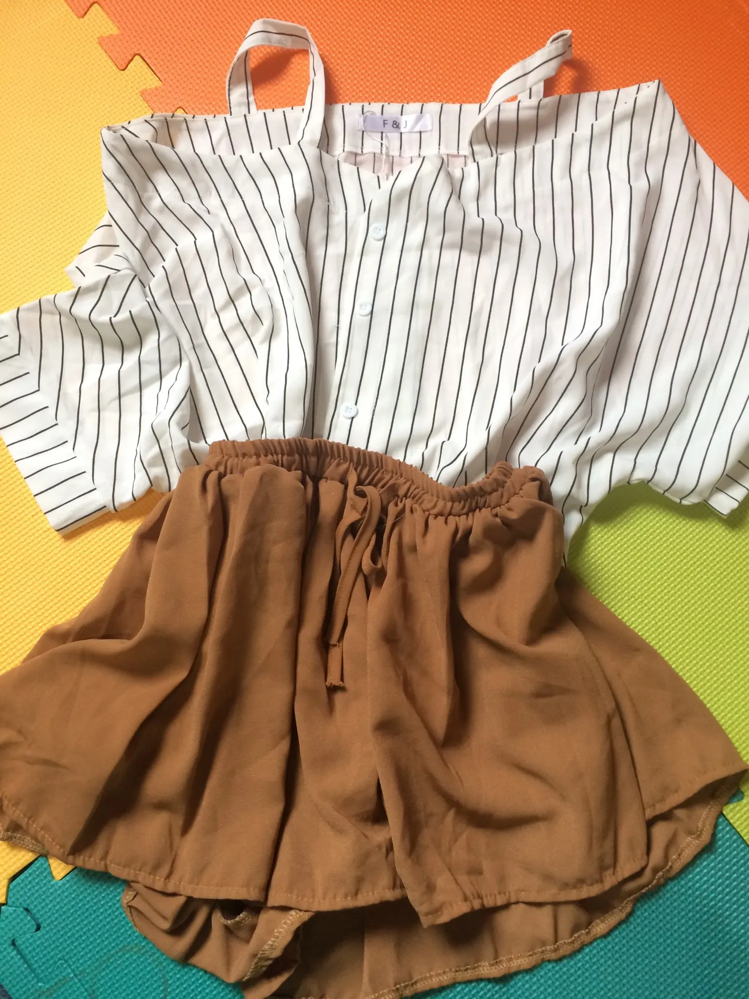Женский костюм-двойка в полоску, Свободный Топ с открытыми плечами и шорты с эластичной талией, 2021