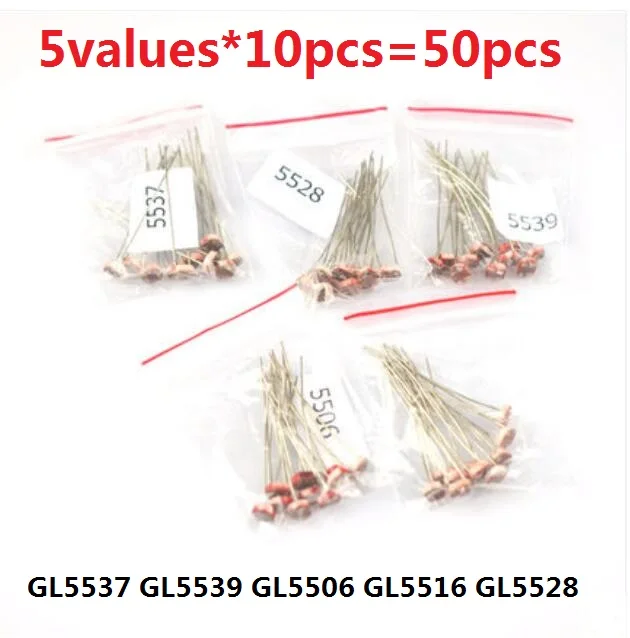 Комплект Фоторезисторов GL5537 GL5539 GL5506 GL5516 GL5528 5 значений * 10 шт. = 50 шт. светочувствительные резисторы 5537 5539 5506 5516 5528 комплект