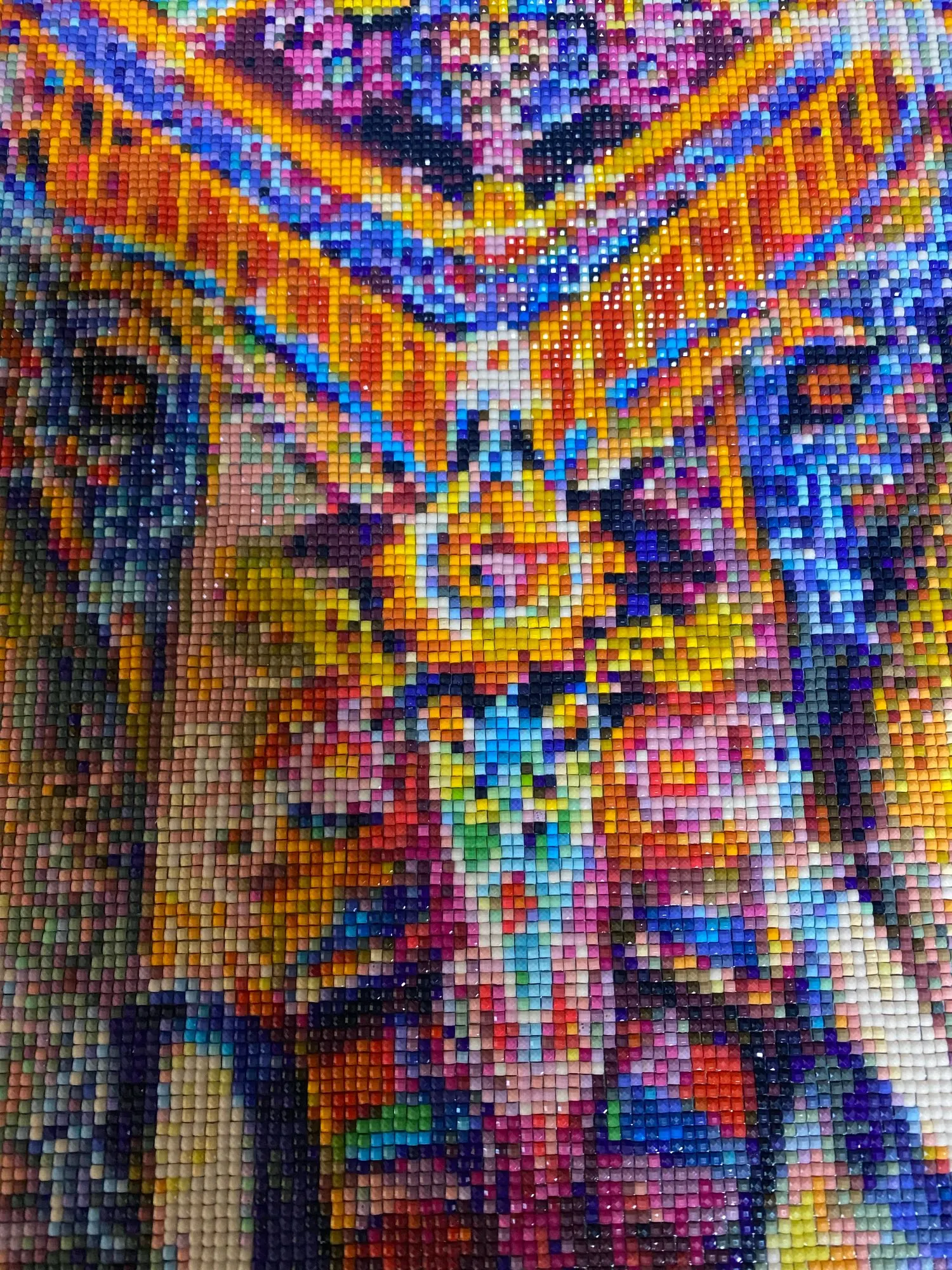 Хорошо упаковано, сама картина на круглом пенопласте, без заломов. Мозаики много, с запасом. В наборе есть все, от пинцета до пакетиков для остатков мозаики