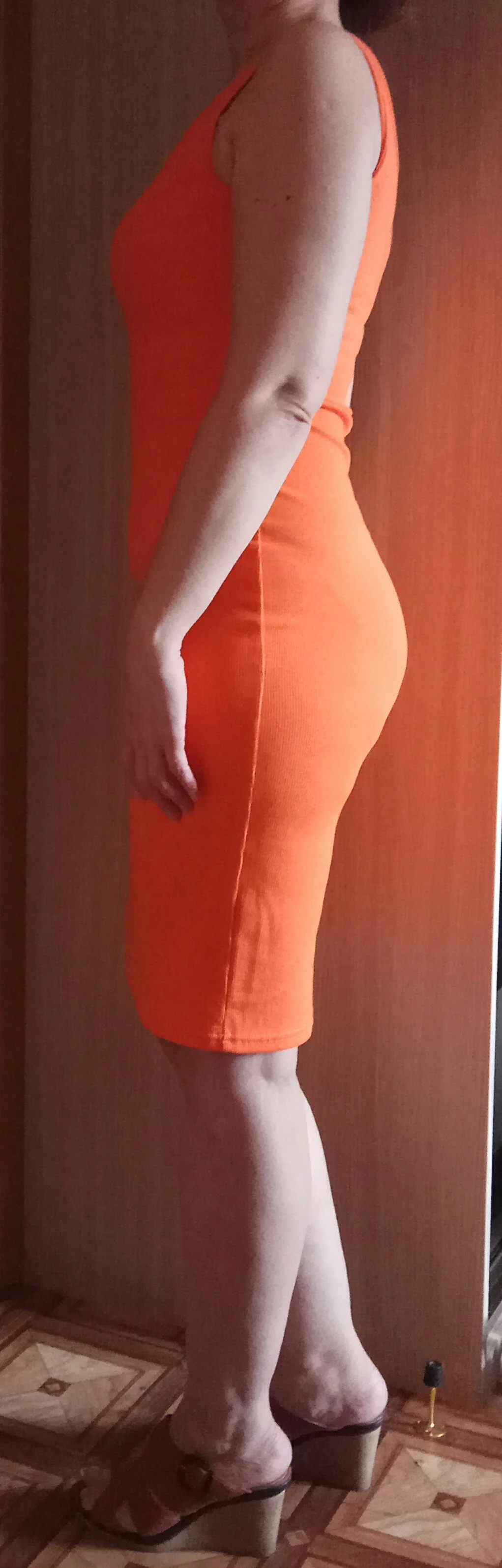 Платье как длинная футболка в рубчик. Качественно сшито, на рост 164 ниже колена на 5 см. На мои 93/75/98 L-ка в обтяг, но летом на отдыхе пойдёт.