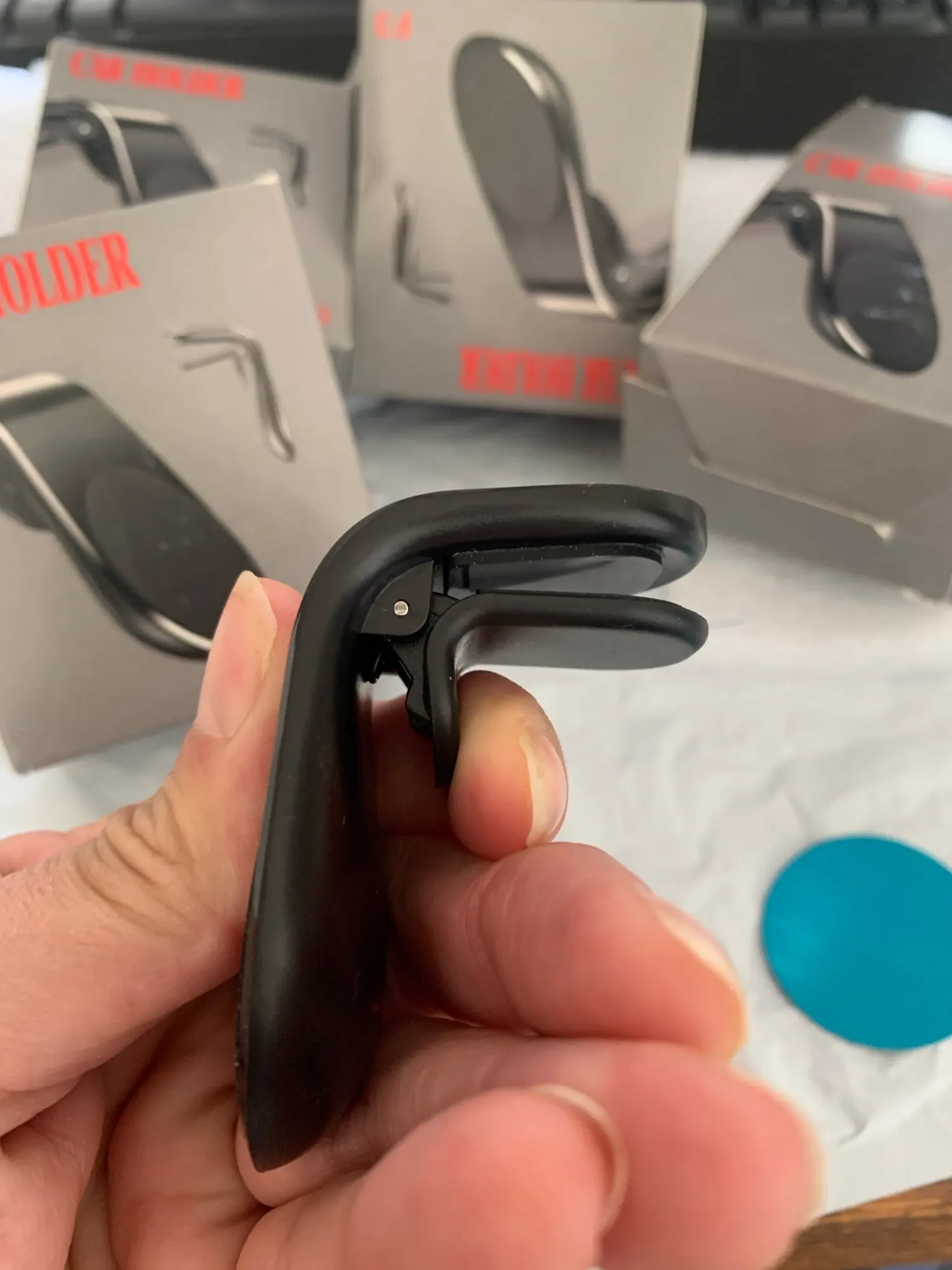 Заказываю этот держатель уже второй раз, теперь жене в машину. Оказался очень удобным несмотря на компактные размеры. Довольно мощные магниты: удерживают Mi Max 2 в чехле. Принесли с почтой месяца через 1.5 в МО. Упаковано отлично, ничего не помялось. В отличие от прошлого серебристого, этот аспидно черного цвета. Доволен