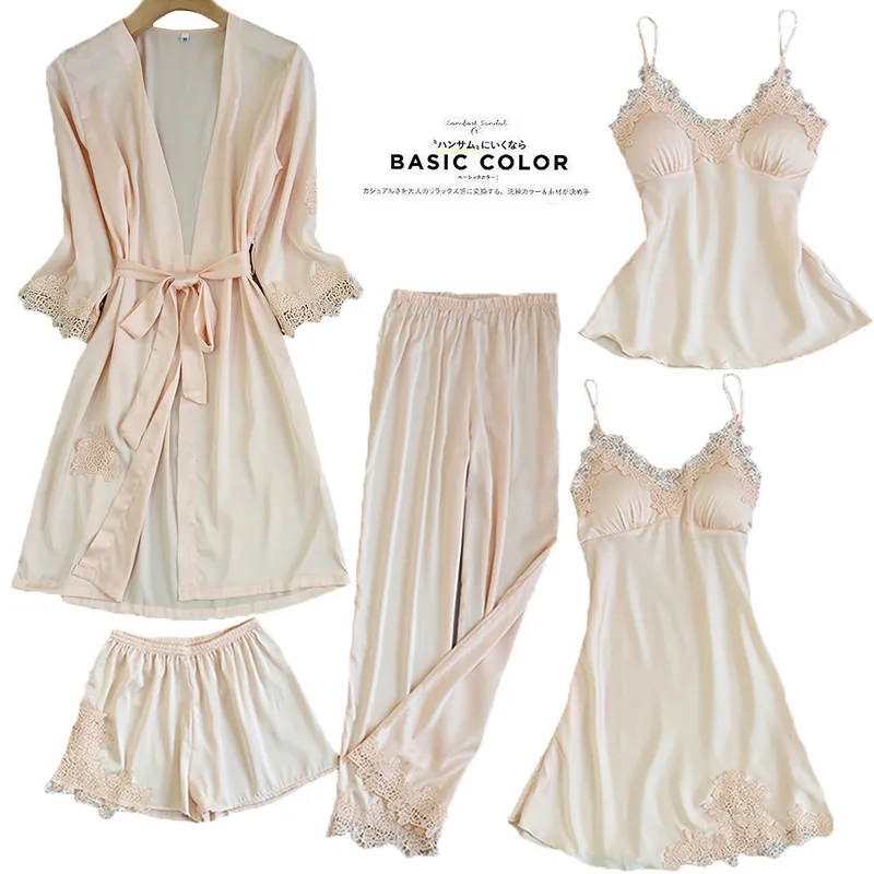 Пижамный комплект из 5 предметов, Женская атласная кружевная одежда для сна, весна-осень, шелковое кимоно, халат для сна, банный халат с подкладками на груди, домашняя пижама