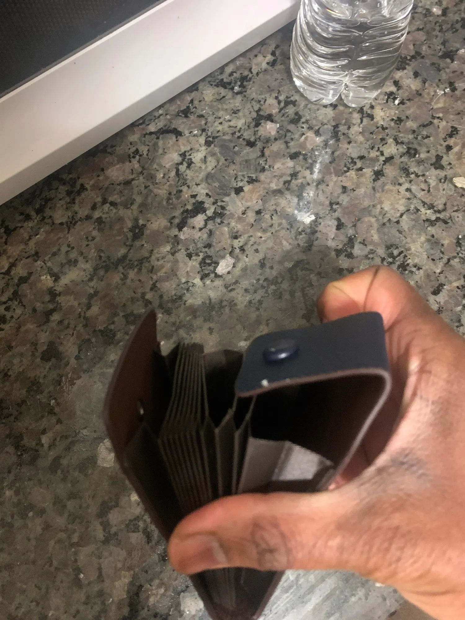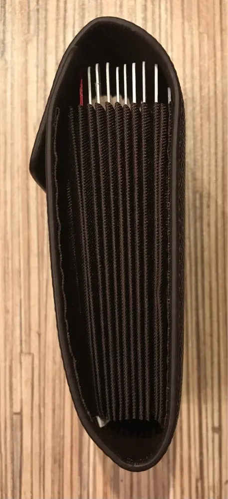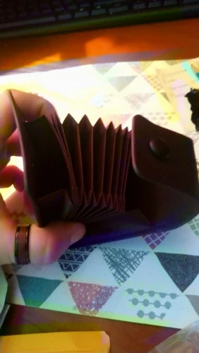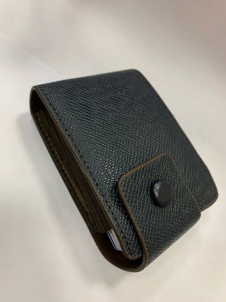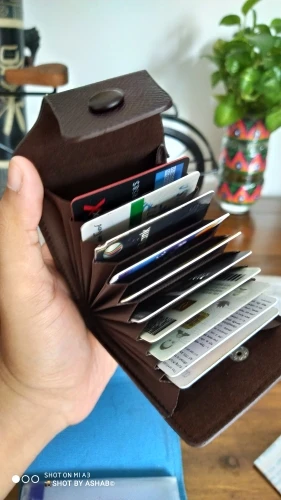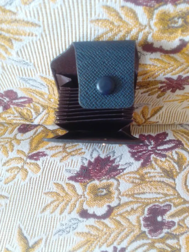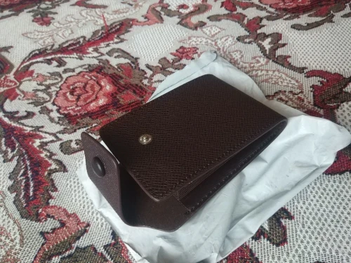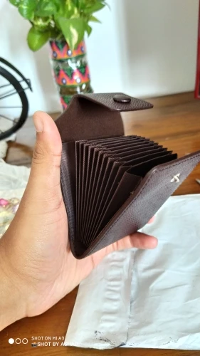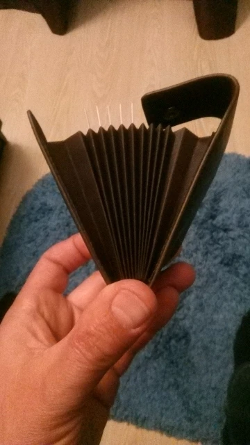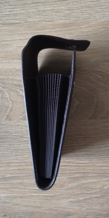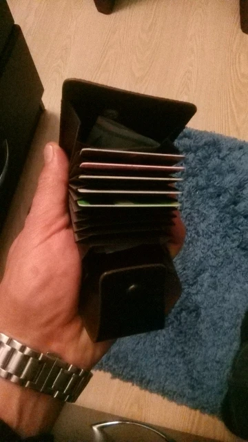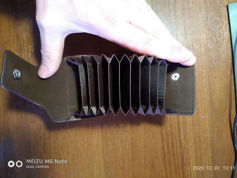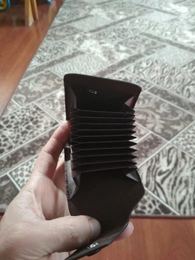крепкий, хороший кошелёк-визитница. влезает достаточно много карт, но крайние два отделения по дизайну не примыкают к основанию, поэтому с монетами могут возникнуть проблемы. очень качественно сделано. в Беларусь, Минск шло 46 дней