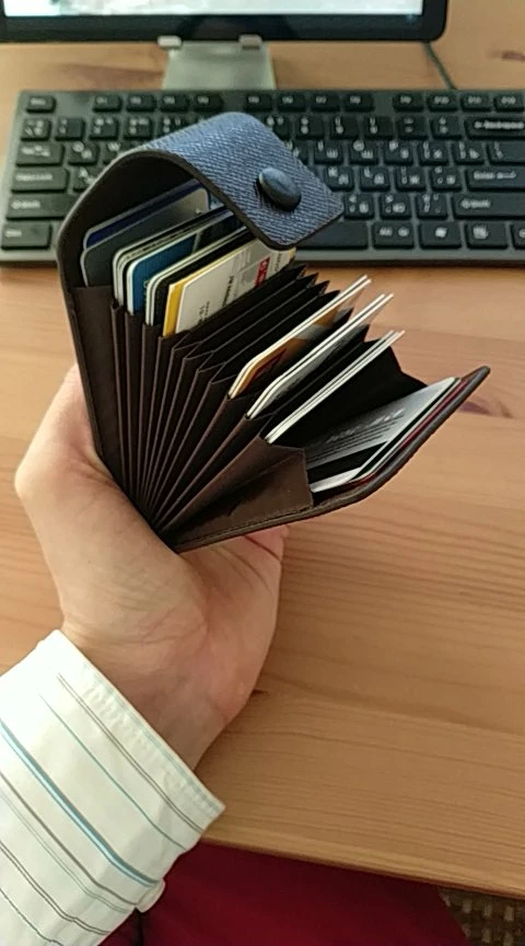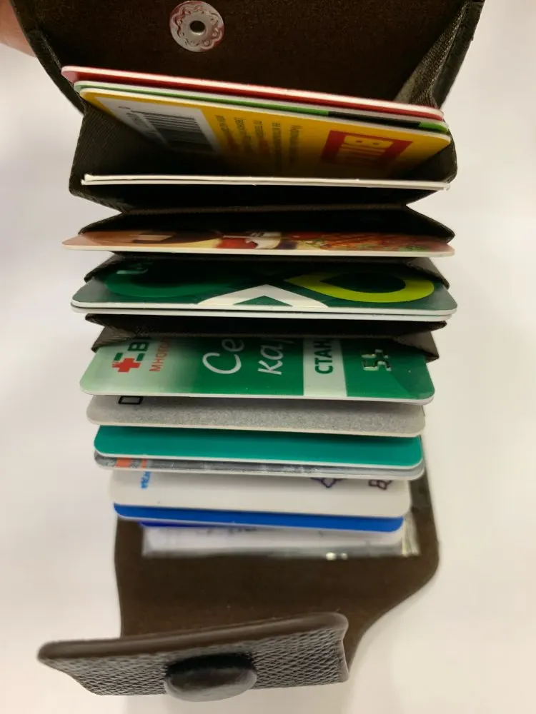 Очень удобный кошелек для хранения скидочных карт. Входит больше десятка. В один отсек можно положить сразу 2 карты при желании. Видны корешки карт, что облегчет поиск. Карты держатся в отсеках плотно, ничего не выпадывает. Рекомендую.