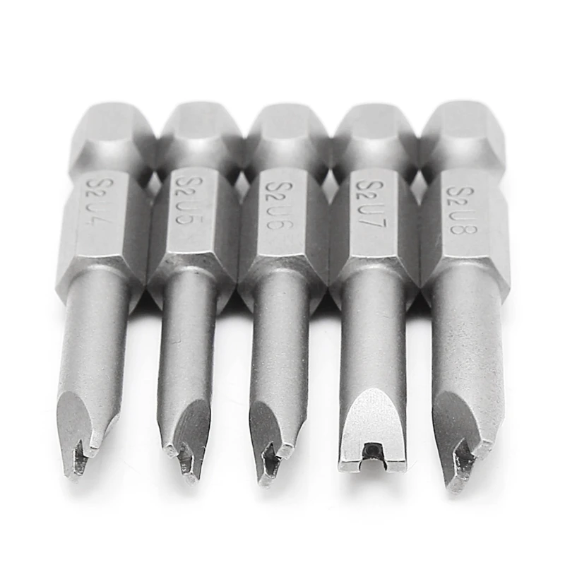 Технические характеристики Материалы: легированная сталь S2 Тип головки: u-образный Длина: 50 мм Размер: U4,U5,U6,U7,U8 Хвостовик Диаметр: 6,35 мм/1/4 дюймов Количество: 1 комплект/5 шт.
