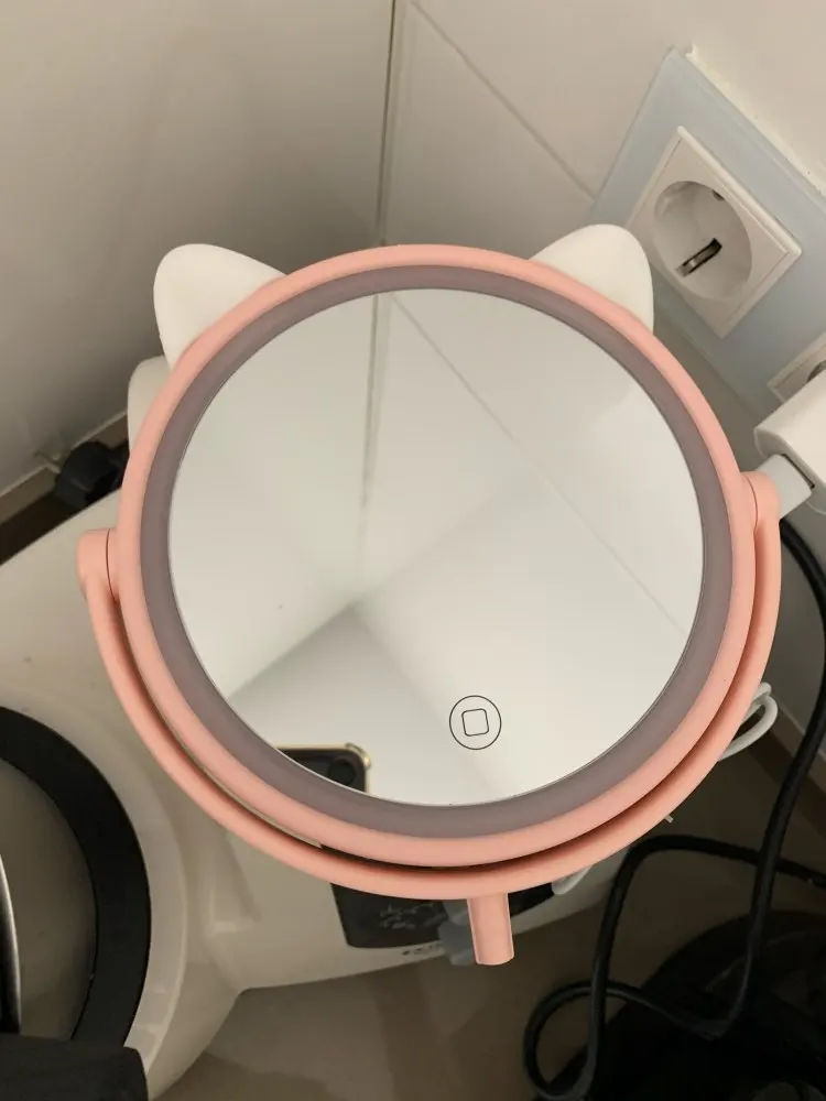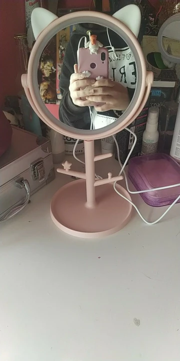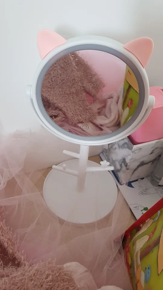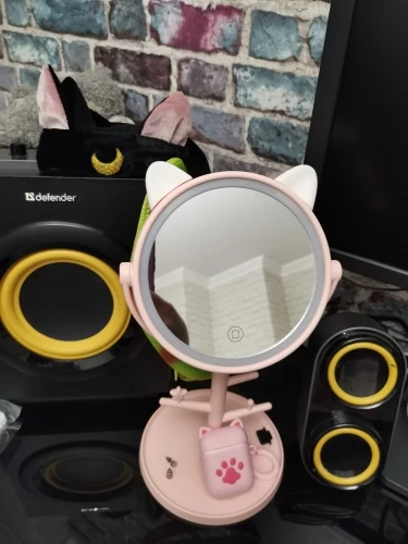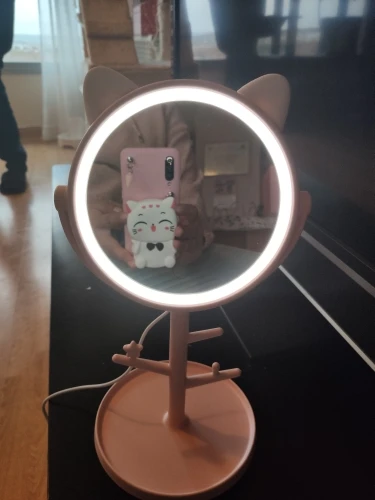 Зеркало очень хорошего качества, пластик обработан как положено и ничем не пахнет. Зеркало приехало в целости и сохранности в комплекте с кабелем. На подставку тут же приспособила кольца и браслеты, но из-за пимпок на второй и третьей ветке подставку трудно использовать целиком. На большое блюдо-ножку можно накидать все, что не влезло. На фото самый слабый и самый яркий режим подсветки в условиях полной темноты. Высота ножки как раз, чтобы краситься, не горбясь и не вытягивая шею. Для сравнения высоты рядом книжка