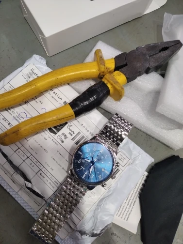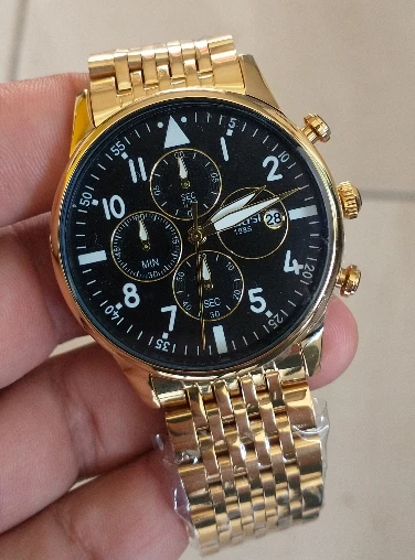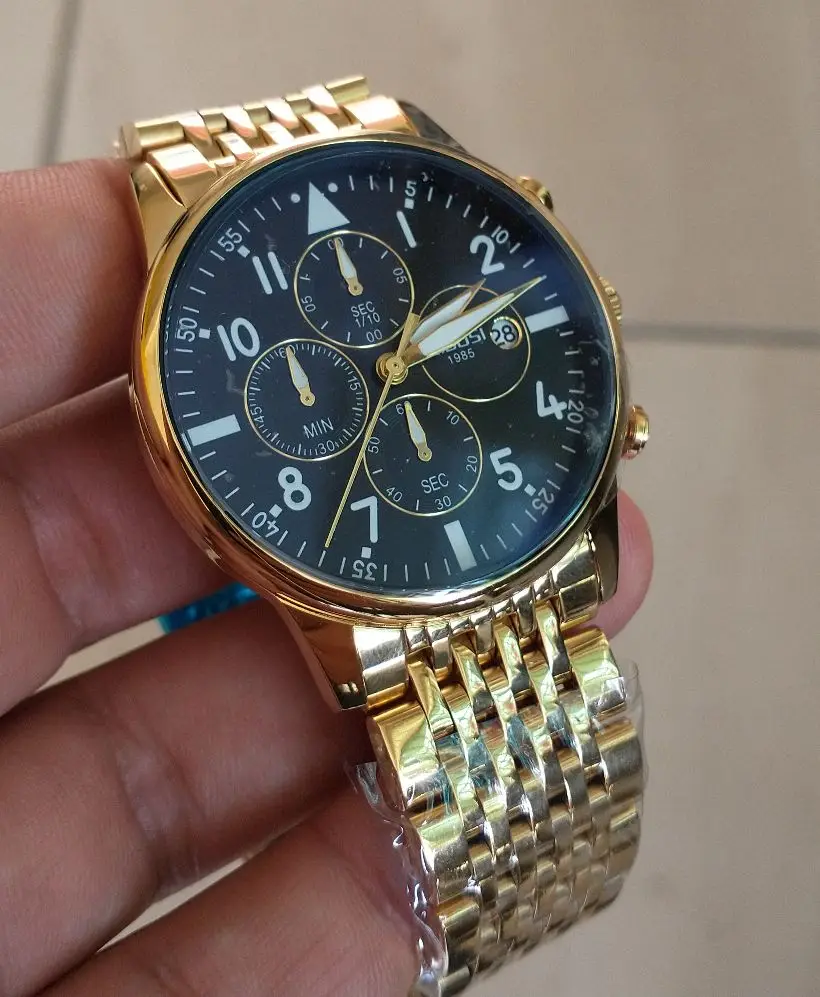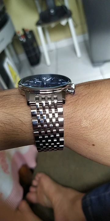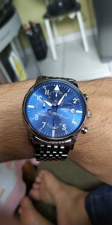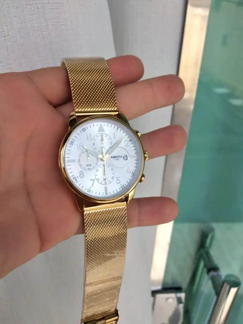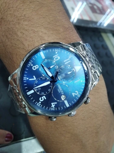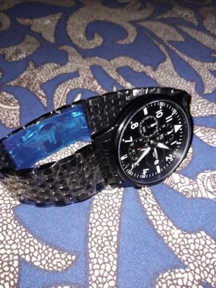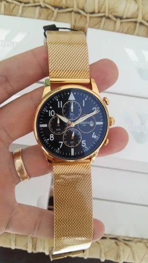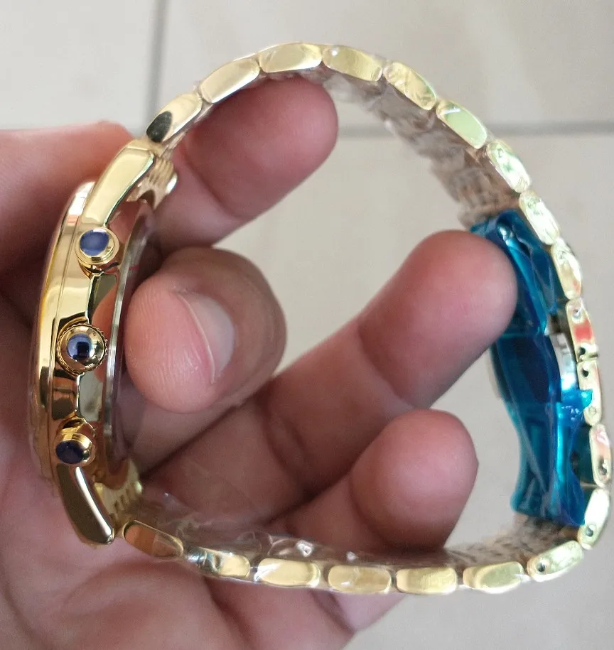 Часы очень красивые в живую (как на рекламной фотографии), функциональные во всем, мне очень понравился браслет, потому что он сделан из твердых звеньев до изогнутой кончика, он измеряет 42 мм в ширину коробки и 22 мм в ширину браслета, минеральное стекло с воздухом (антибликовое), Единственная деталь в том, что коробка не из нержавеющей стали, это другой материал, который я не знаю (сплав или латунь), так как я заметил в золотой подкладке определенные пузырьки и пятна, которые несовершенны в подкладке, когда в коробке есть ржавчина. За заплаченную цену и упомянутую выше, я очень рекомендую это, вы не пожалеете об этом.