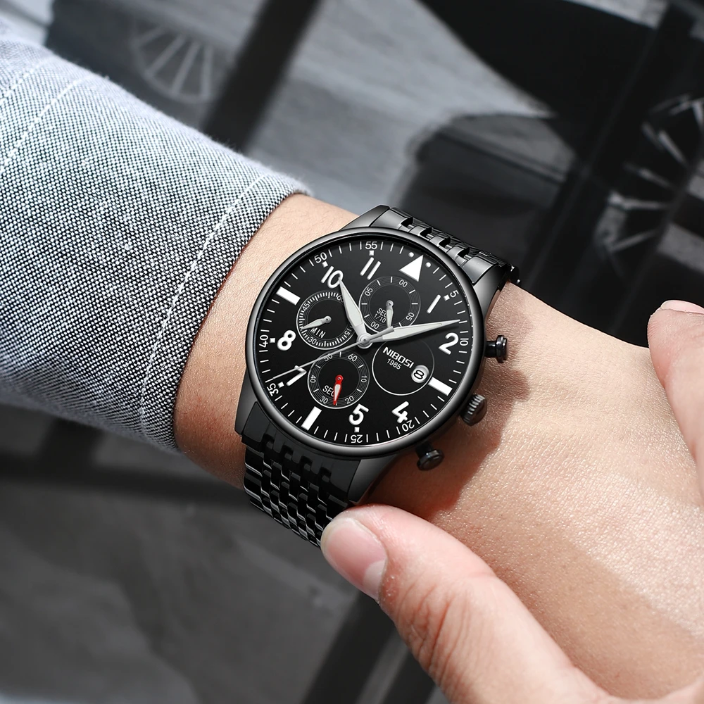 Часы наручные NIBOSI Мужские кварцевые в стиле милитари, роскошные брендовые модные с хронографом, из нержавеющей стали