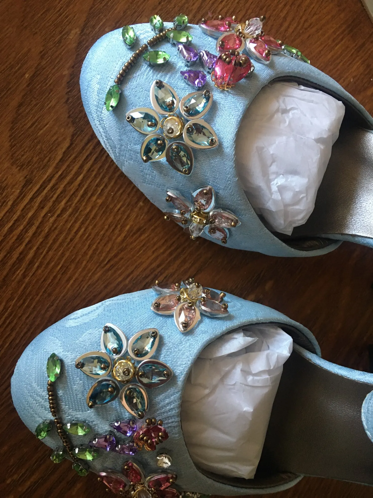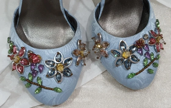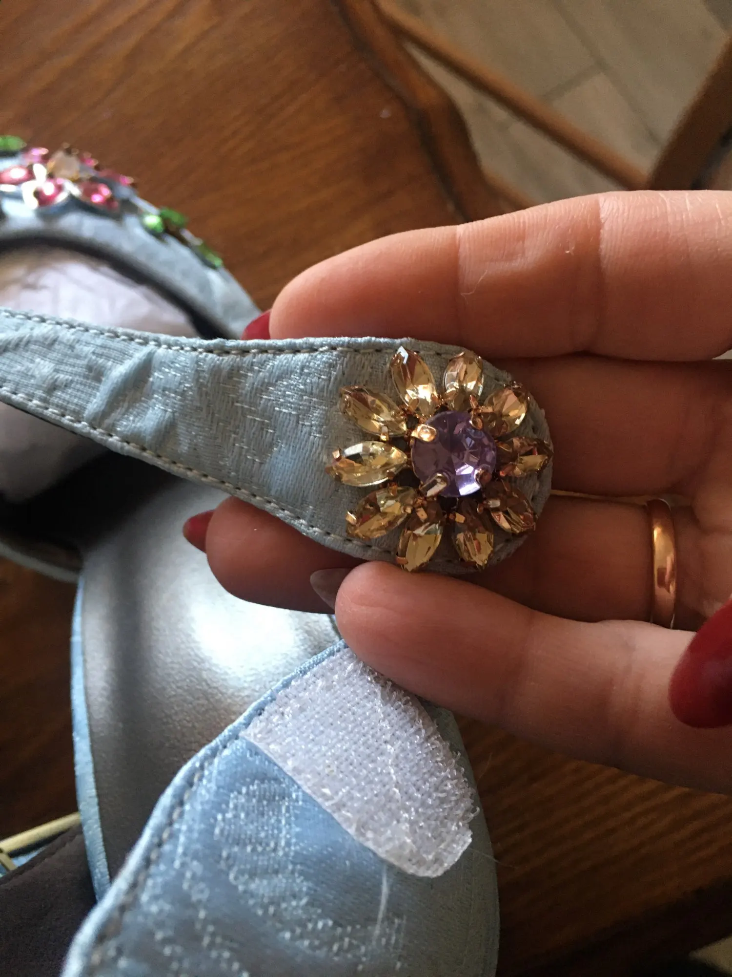 Туфельки выполнены очень аккуратно, присутствует небольшой запах клея, стразы не пришиты, а приклеены, надеюсь, что отвалятся не сразу... Липучка на застежке сильная. Общее впечатление хорошее, но они великоваты! Хоть продавец и посоветовал на длину стопы 26 взять 42, они оказались велики