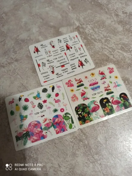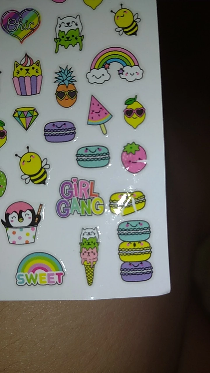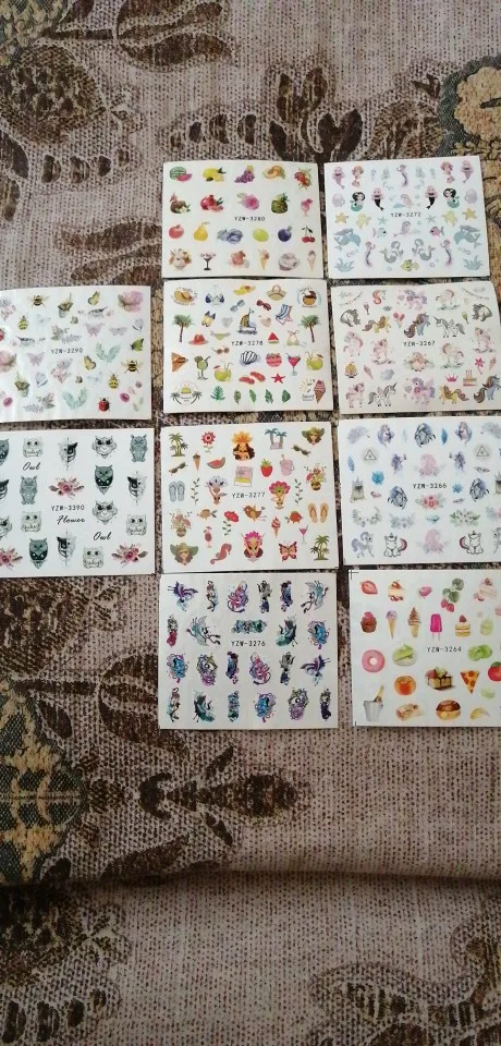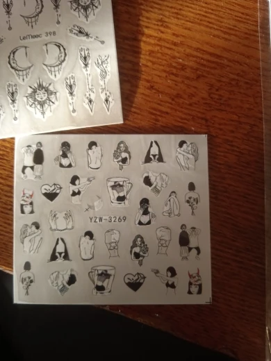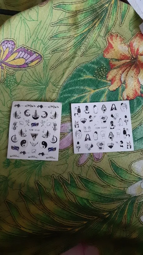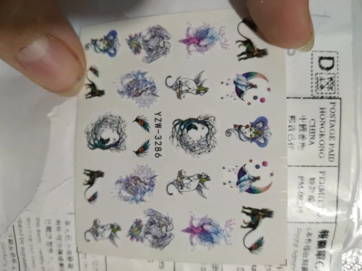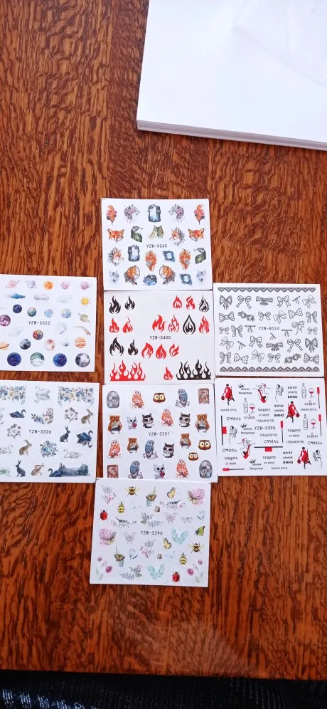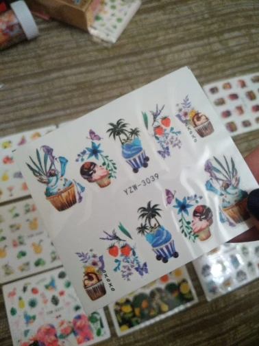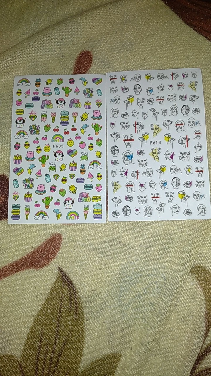Наклейки неплохого качества за такую цену . Шли быстро, трек номер отслеживался до самого конца ( несмотря на то , что два листа и упаковка весом 5 грамм ). По виду наклейки точно такие же как и на картинке . На деле ещё не пробовала , нужно разрезать лист , но из-за отходящего верхнего слоя ( он плохо держится ), это делать не удобно .