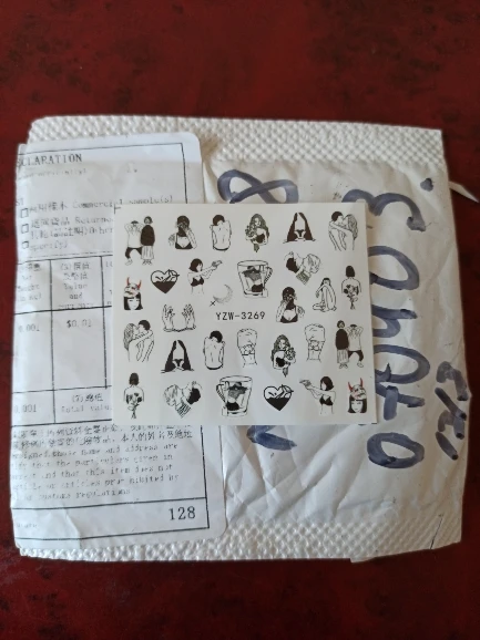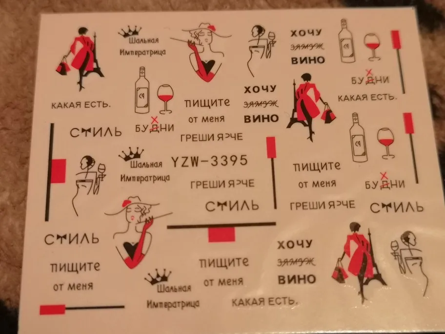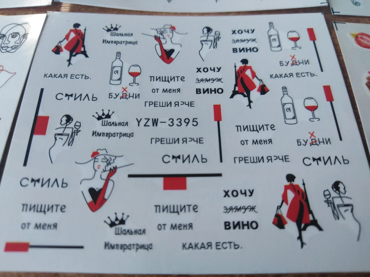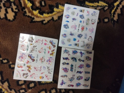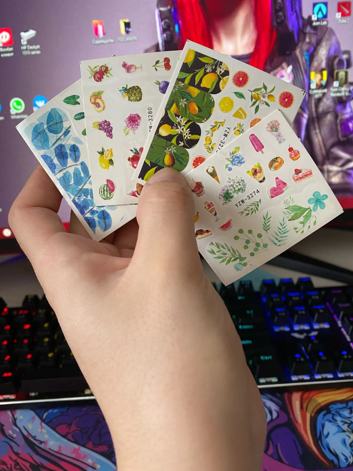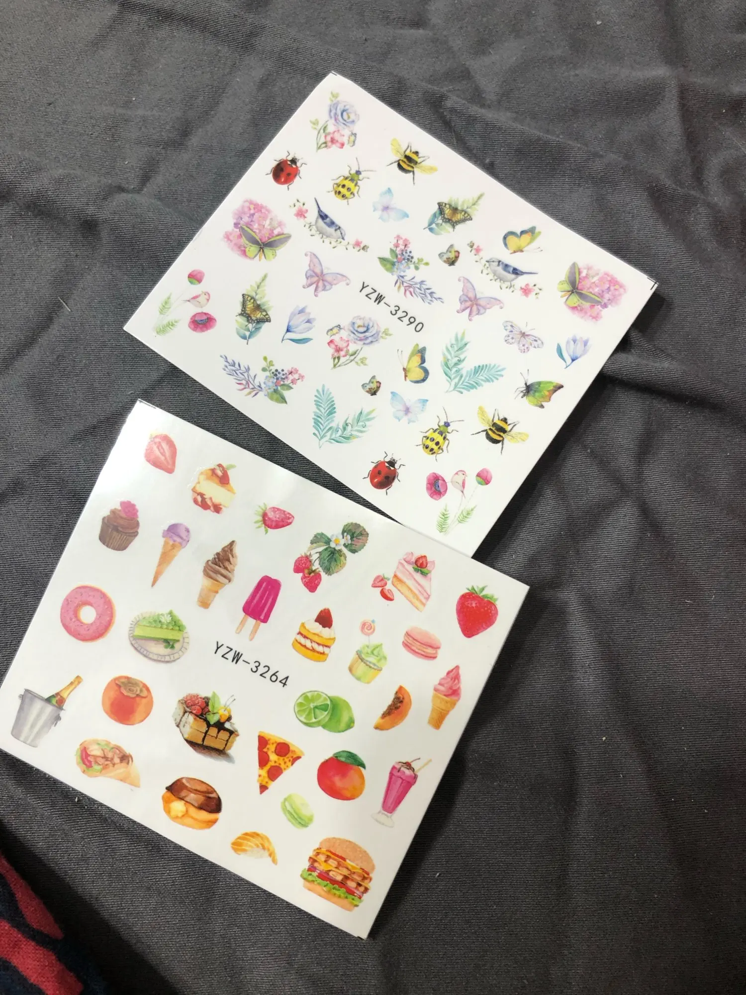 Наклейки неплохого качества за такую цену . Шли быстро, трек номер отслеживался до самого конца ( несмотря на то , что два листа и упаковка весом 5 грамм ). По виду наклейки точно такие же как и на картинке . На деле ещё не пробовала , нужно разрезать лист , но из-за отходящего верхнего слоя ( он плохо держится ), это делать не удобно .