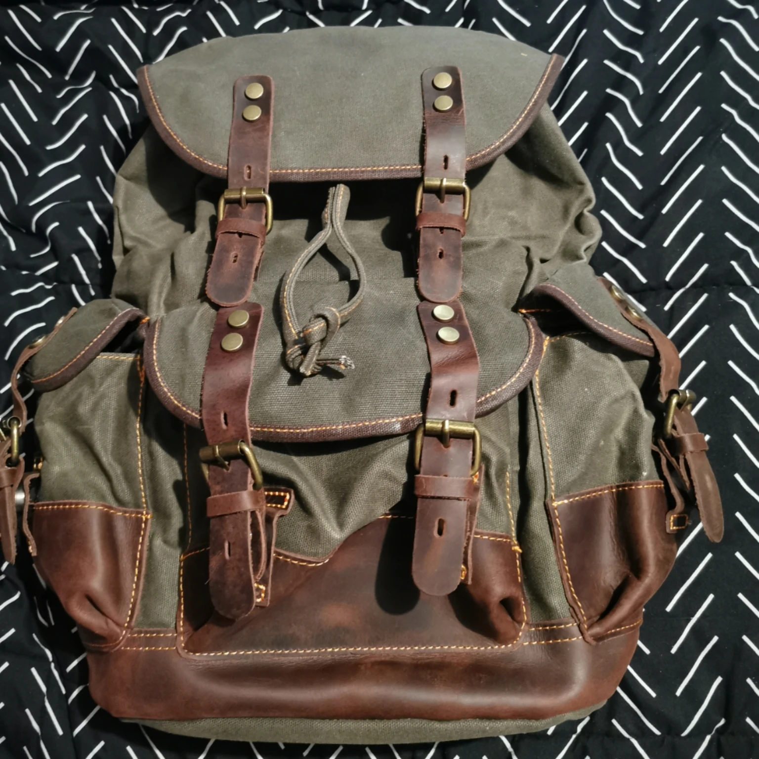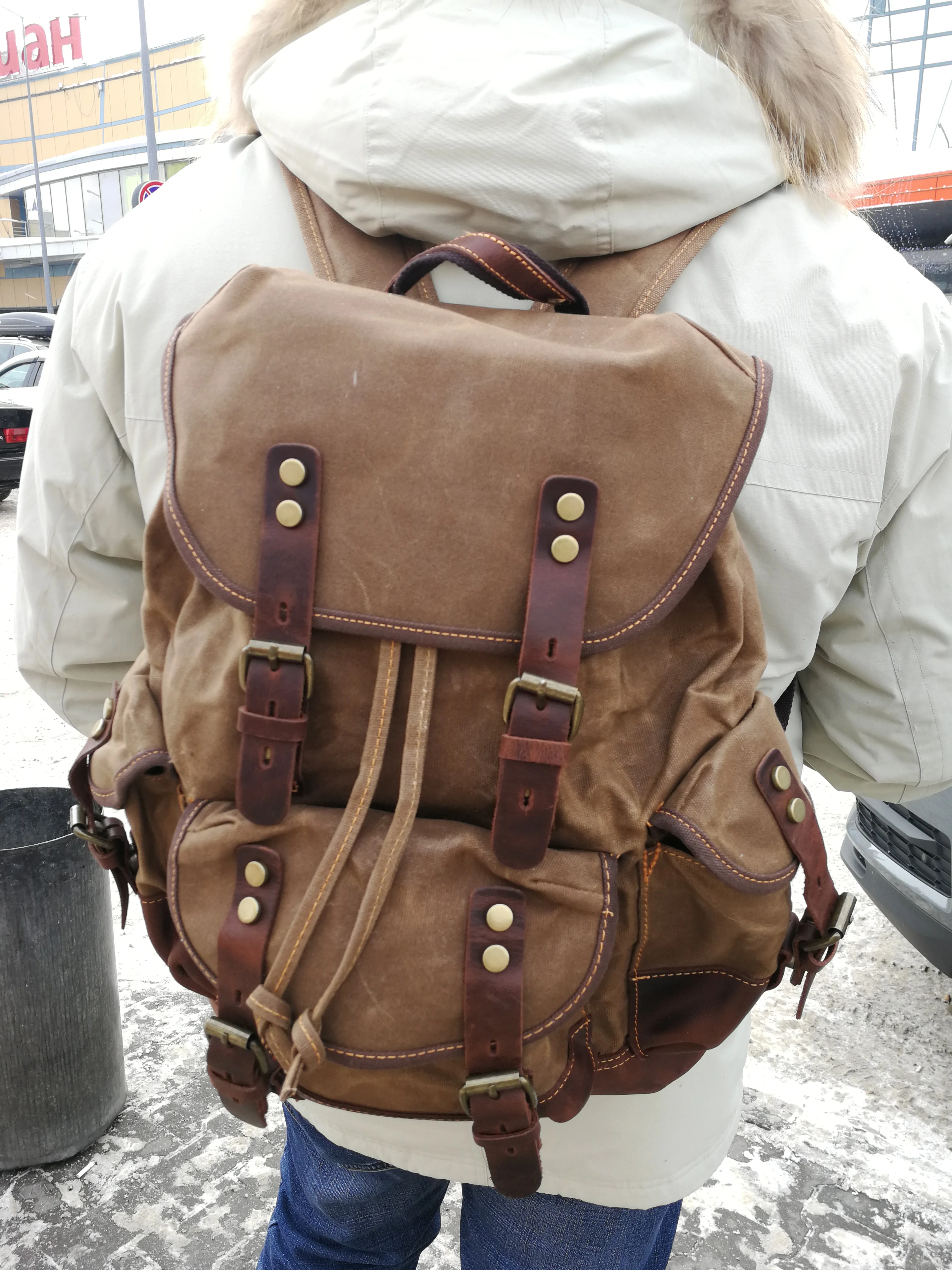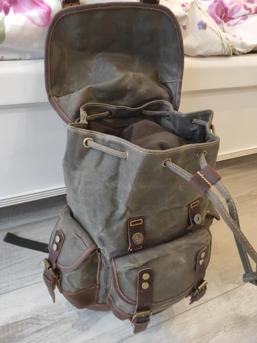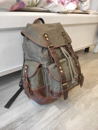 выглядит суперский, пошит качественно, нитки не торчат, один минус - ОЧЕНЬ дубовый материал, по плотности как кожа, только менее эластичный! видны заломы в местах где был сложен во время пересылки. Если бы был вариант такого же рюкзака, но не вощеного - взял бы его. ехал достаточно долго!
