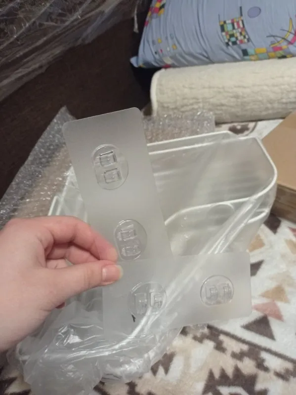 Всё прекрасно, полочка очень вместительная, стоят 6 разных бутылок/банок, всё держится. Поверхность предварительно обезжирила перед наклеиванием крючков. Приехала очень быстро, курьером, с продавцом не общалась. Всем советую.