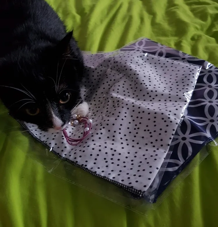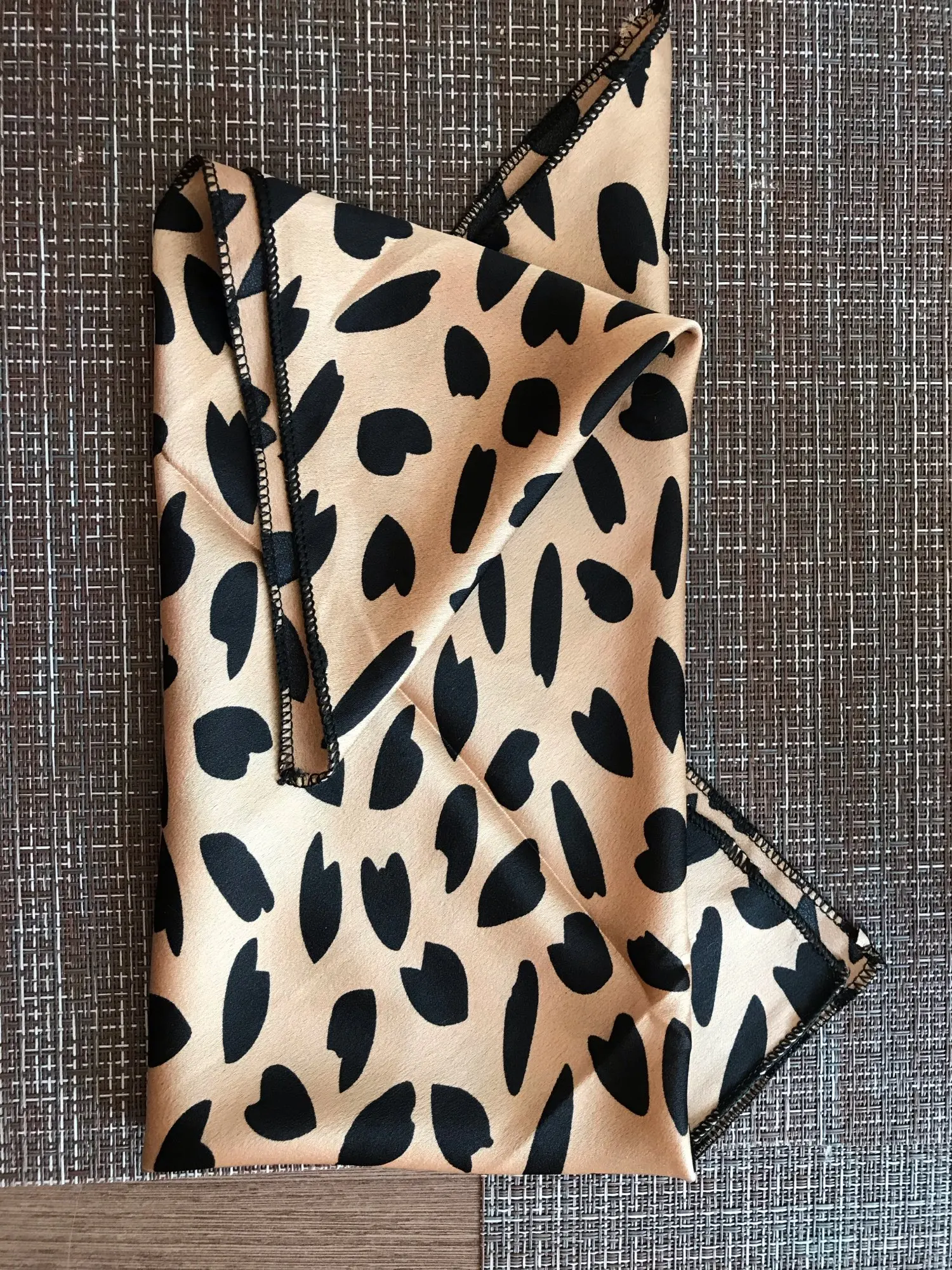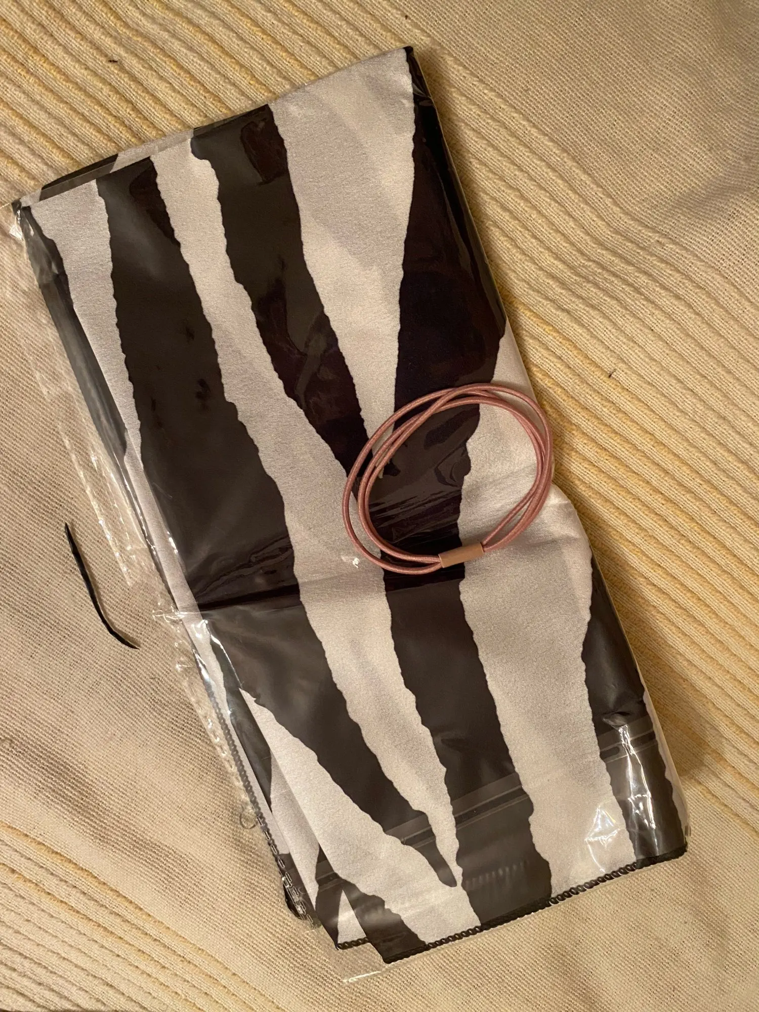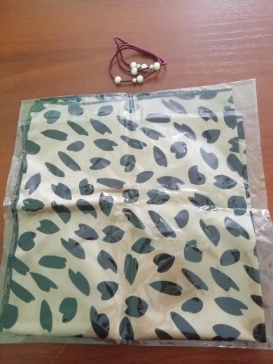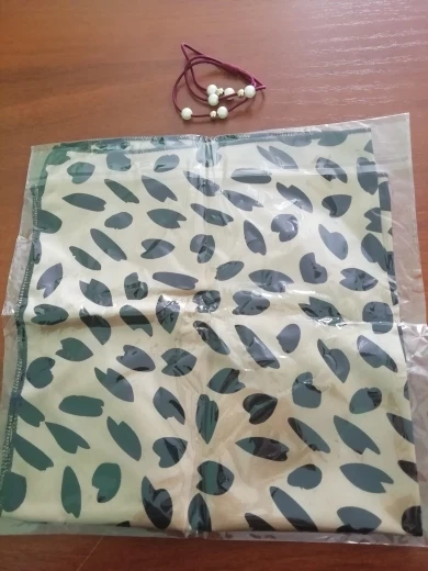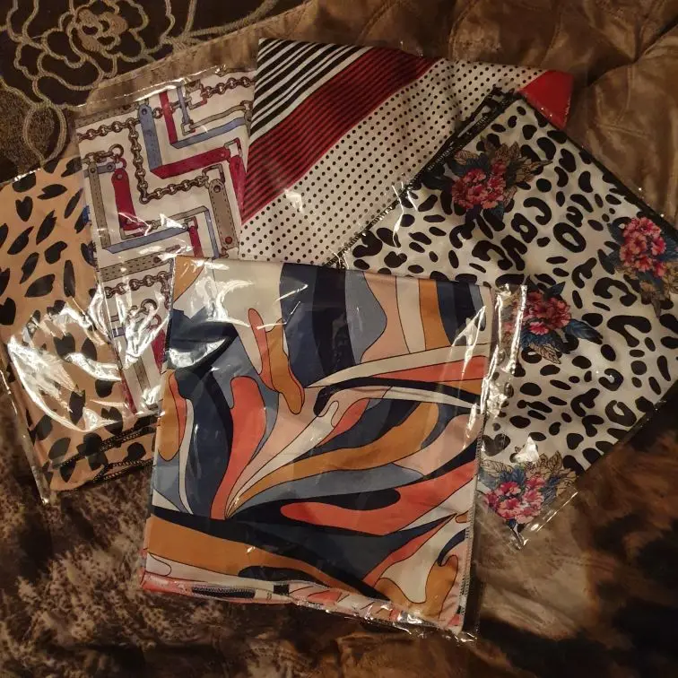 Заказываю в этом магазине второй раз, поэтому в подарок положили резинку для волос (хорошая, тугая - не растягивается). Платок шикарный, использую как украшение для сумки. Из-за ситуации с пандемией заказ шёл около 1.5 месяца.