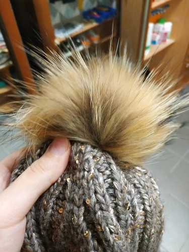 Приходит в сеточке, так что при транспортировке не помялся. На помпоне кнопка, можно прикрепить к любой шапке.