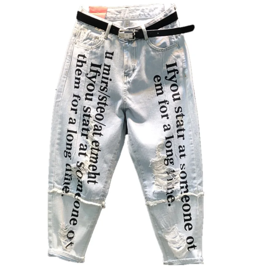 Рваные Джинсы женские летние новые модные свободные шаровары с буквенным принтом до щиколотки