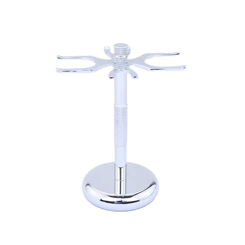 Шикарная подставка, которая расчитана на 4 предмета : 2 станка + 2 помазка. Использование подставки обеспечивает плавное высыхание и хорошую вентиляцию помазков, продлевая время их службы. Также, благодаря подставке лезвия станков не будут контактировать с поверхностью, а значит у них нет шансов затупиться. Ключевые особенности: + прочная конструкция из металлического сплава с хромированием против коррозии; + роскошный дизайн, благодаря которому, изделие станет украшением любой ванной; + удобная и функциональная конструкция, рассчитанная на 4 предмета; + устойчивая опора с нескользящей резиновой подложкой; + накатка на стержне делает изделие более удобным; + подходит для большинства современных бритв и помазков; + конструкцию можно разобрать для промывания и перевозки. Держатель представляет собой штырь, диаметром 11-12 мм с опорным основанием, на котором в виде креста размещены держатели для подвешивания бритвенных станков и кистей. Материал стойки - алюминиево-цинковый сплав.