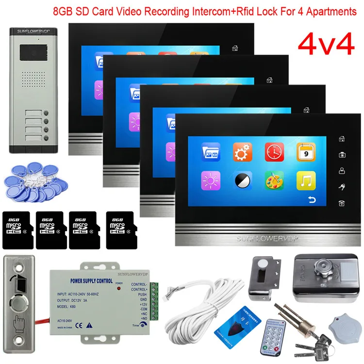 Домашний проводной видеодомофон с Rfid-замком, устройство для записи видео в квартире, 8 Гб 7 дюймов, Sd-карта, внутренний монитор, 4 предмета