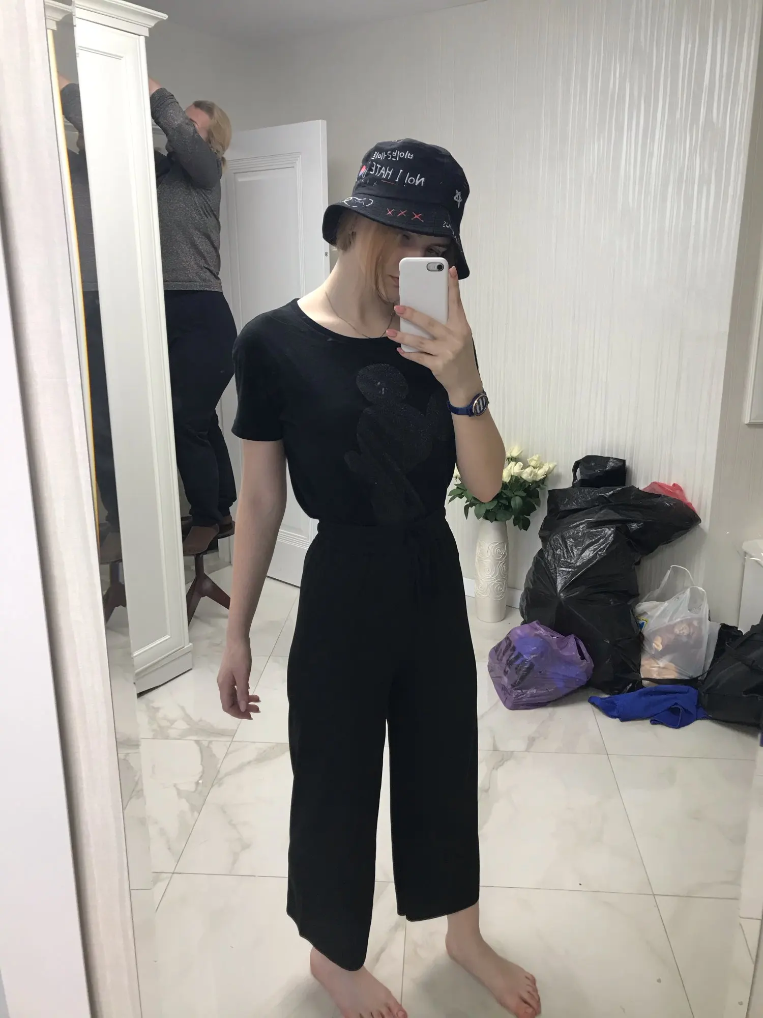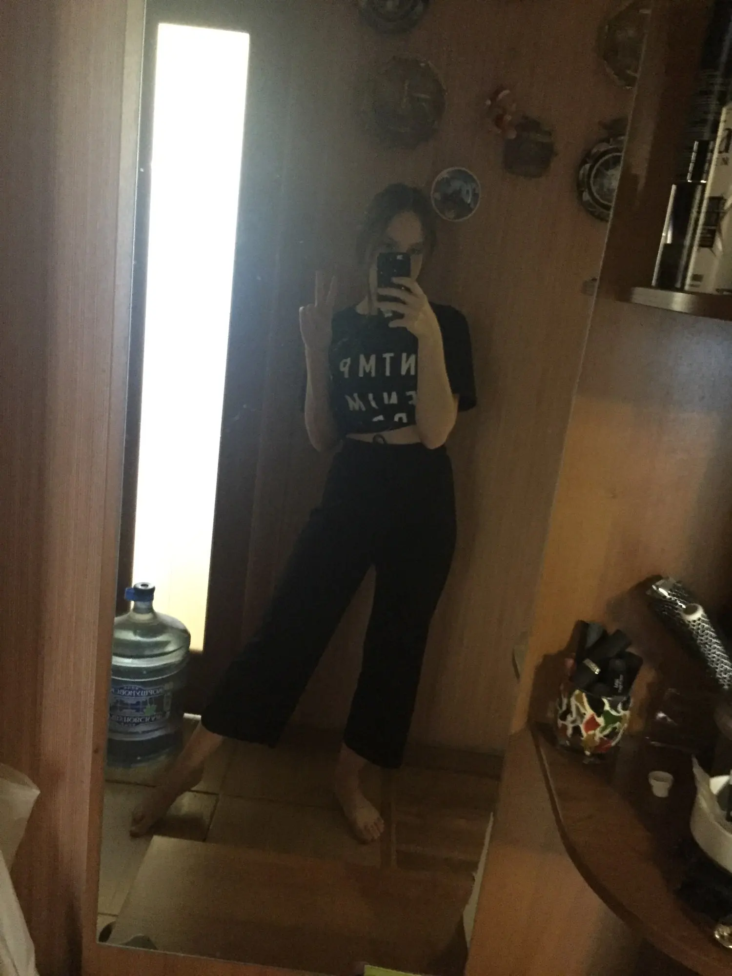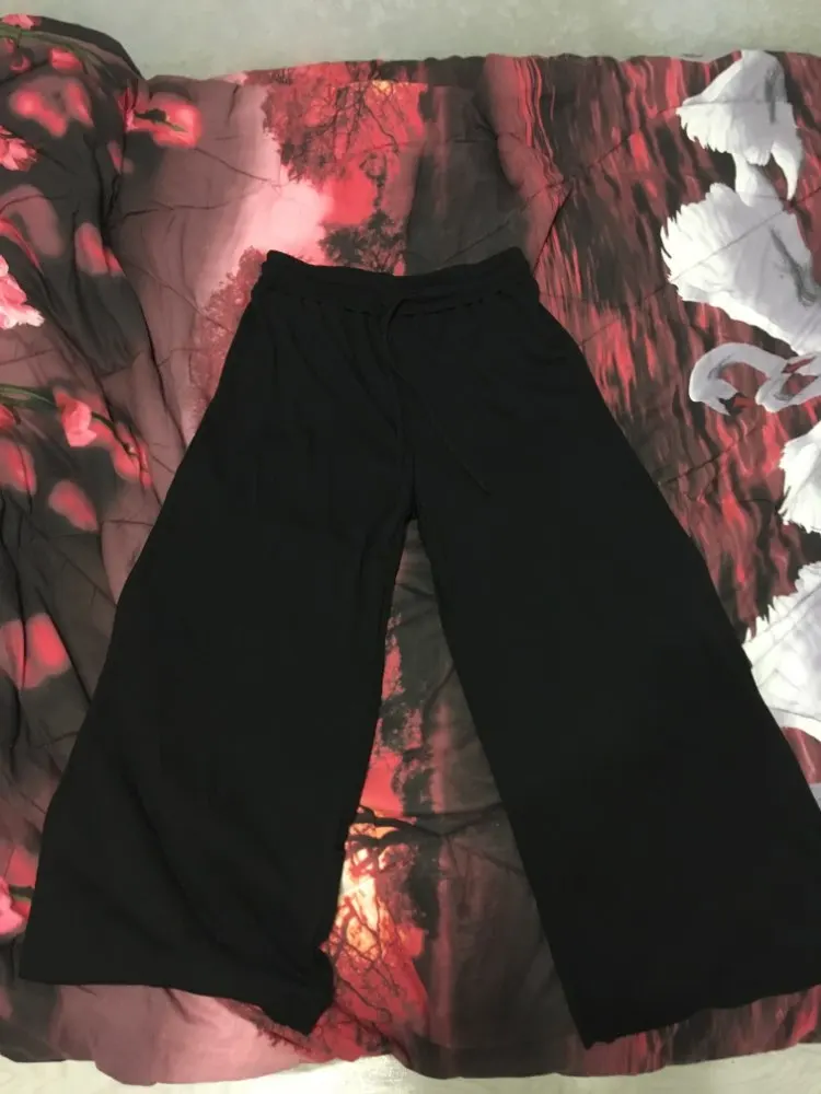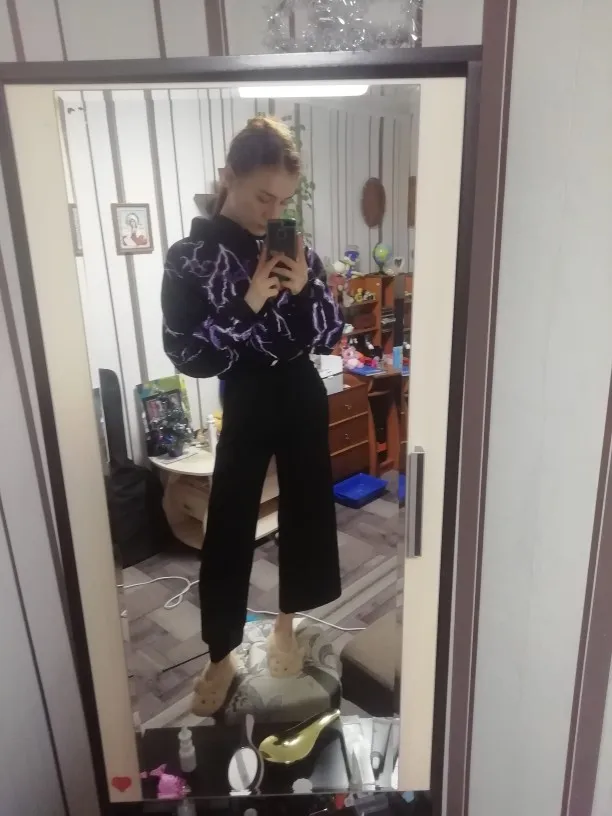 Штаны краш!! Во-первых, хочу отметить молниеносную доставку- всего 9 дней. Ткань очень приятная, не просвечивается, по крайней мере чёрная, она ребристая и мягкая. Норм освещения нет, но какие фотки получилось сделать. Заказывала S на свой S, хотя многие писали брать на два размера больше, но я бы и М не заказала бы даже... Если не любите слишком широкие и объемные вещи, то берите свой размер. У меня примерно 164 рост, 91 бёдра, 63 талия, все классно, супер, резиночка если что слегка затягивает, если вдруг свободно. Рекомендую вообщем)))