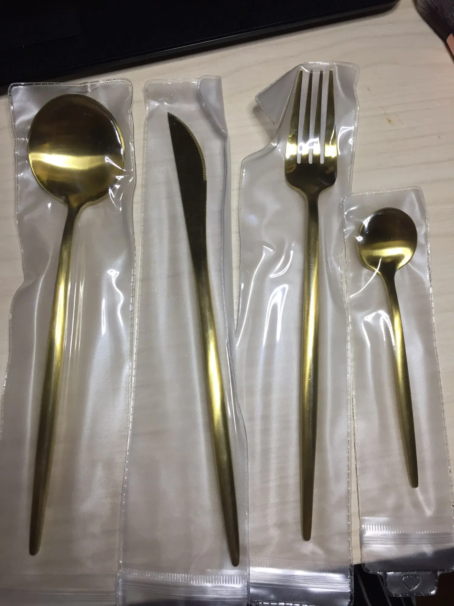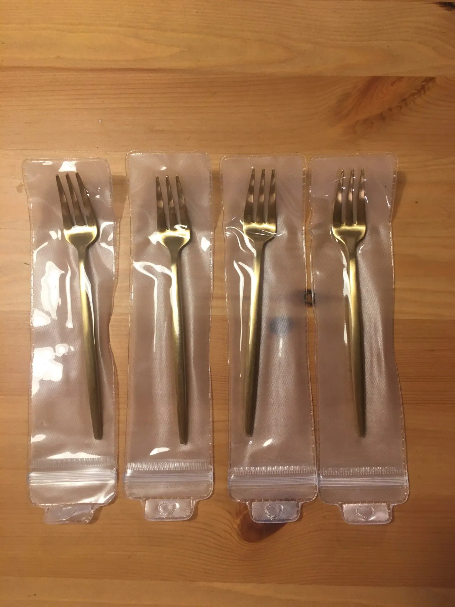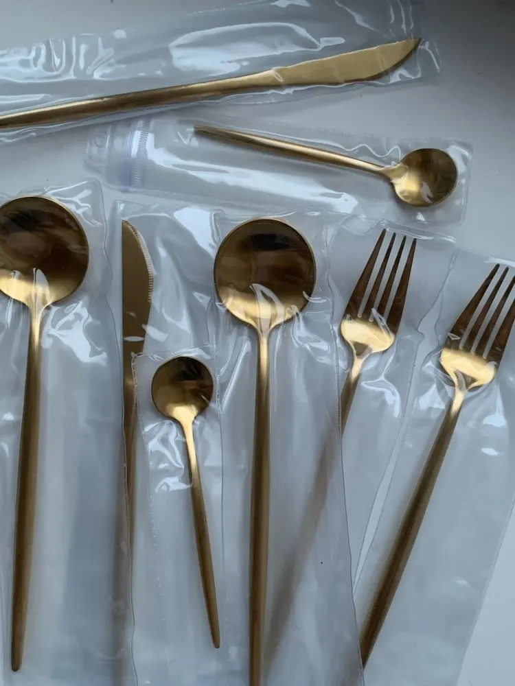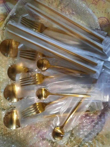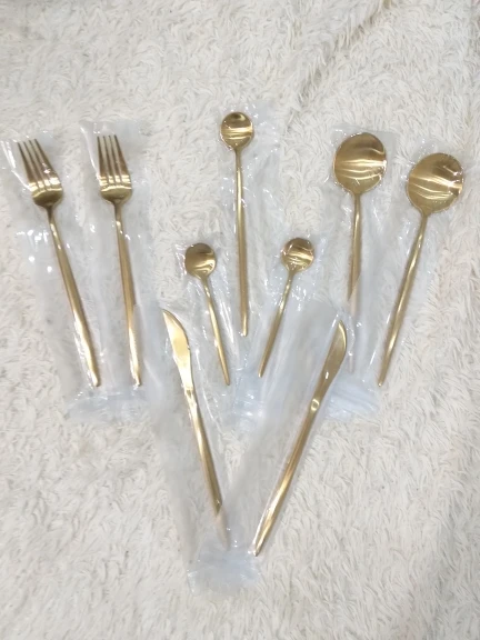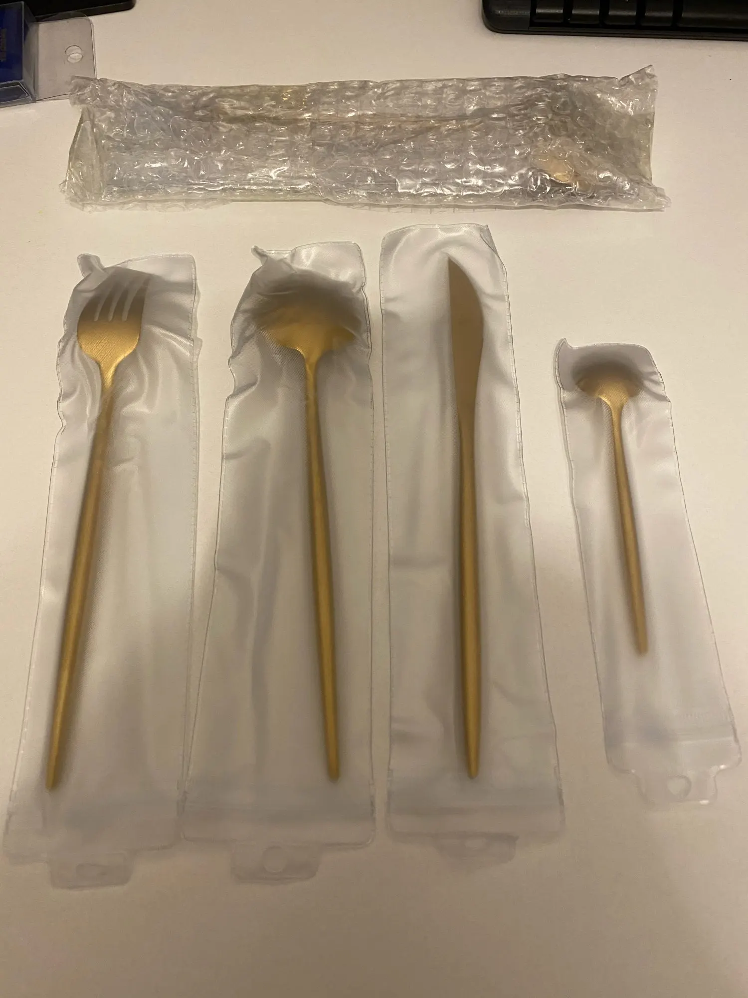 Товар хорошо упакован в отдельные закрывающиеся пакеты. Столовые приборы соответствуют описанию, матовые золотые, и они не очень легкие. Доволен!