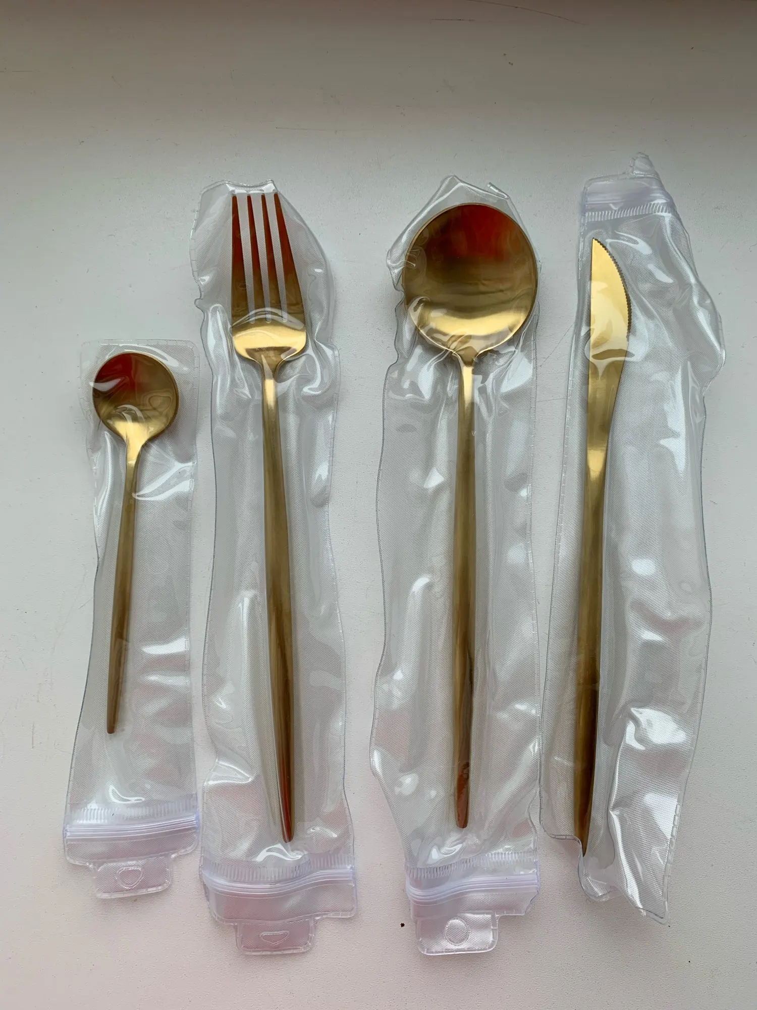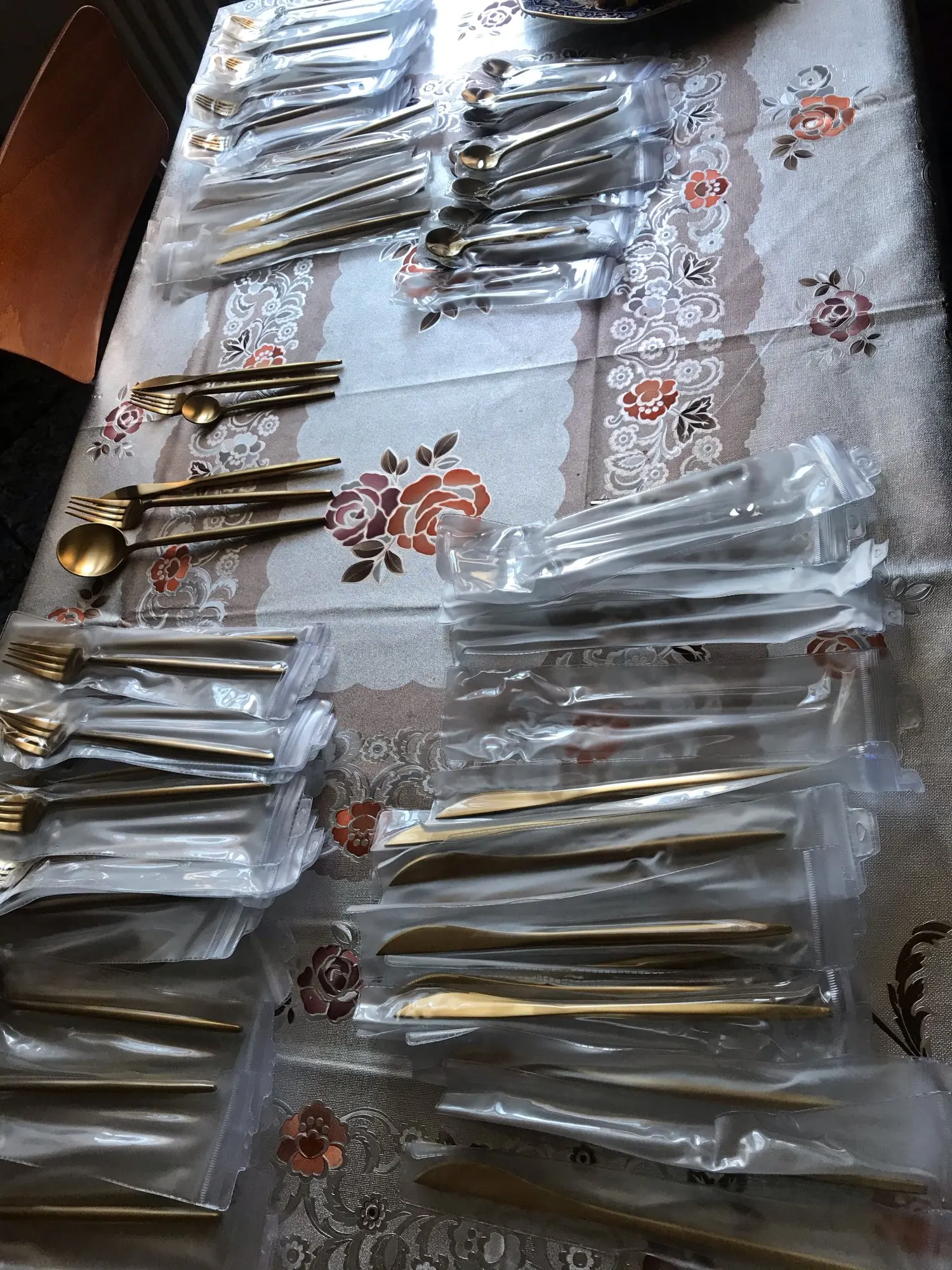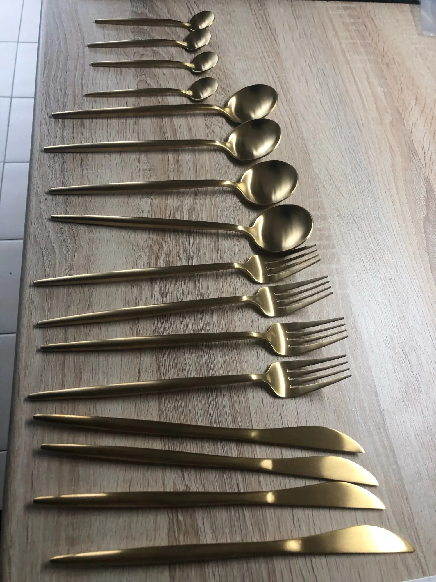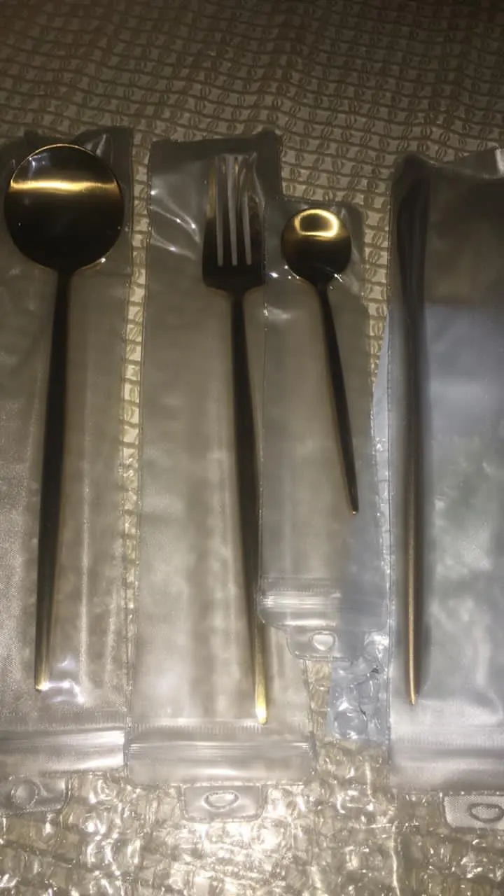 Товар хорошо упакован в отдельные закрывающиеся пакеты. Столовые приборы соответствуют описанию, матовые золотые, и они не очень легкие. Доволен!
