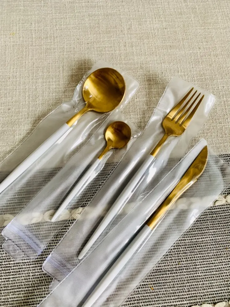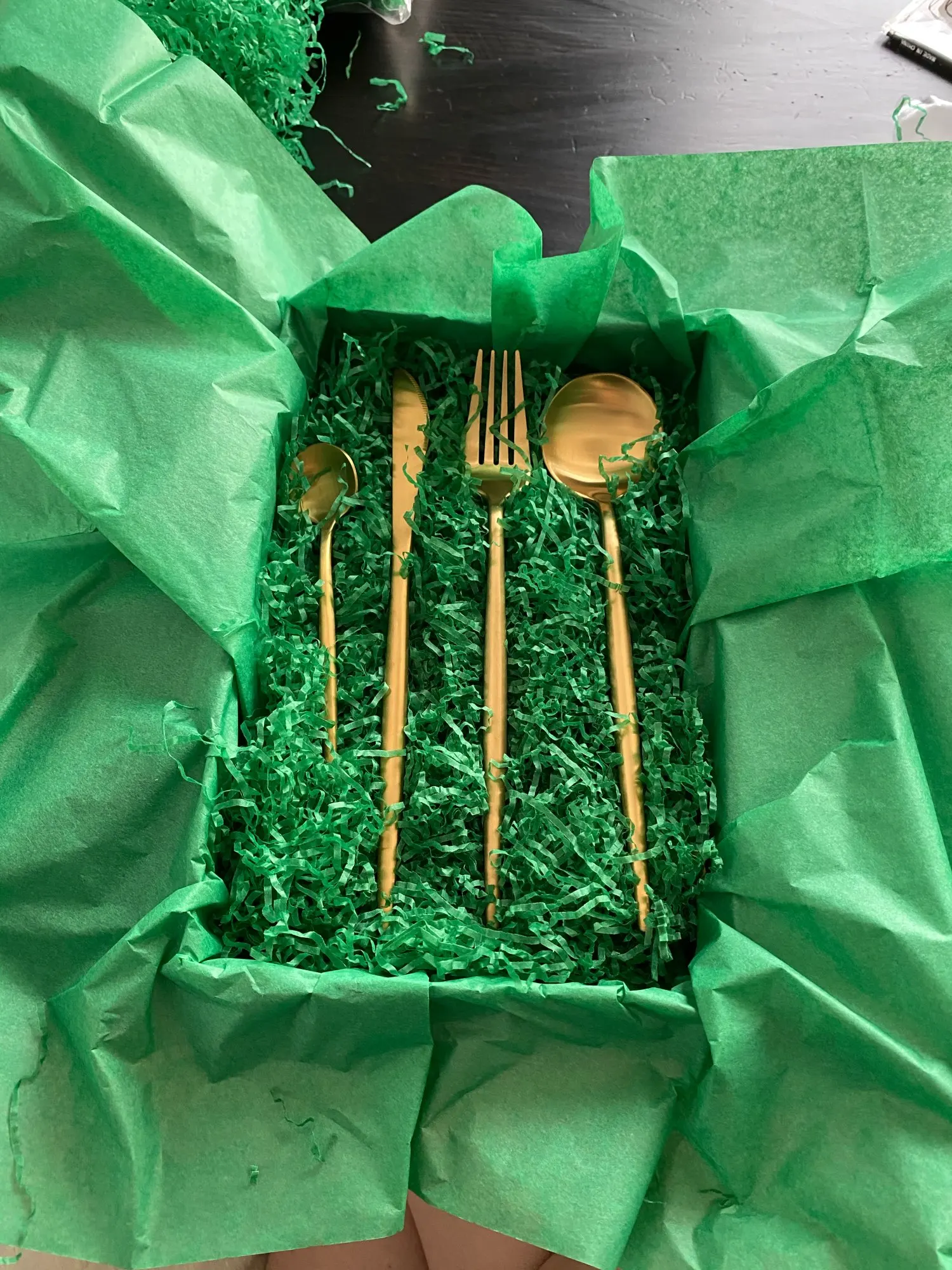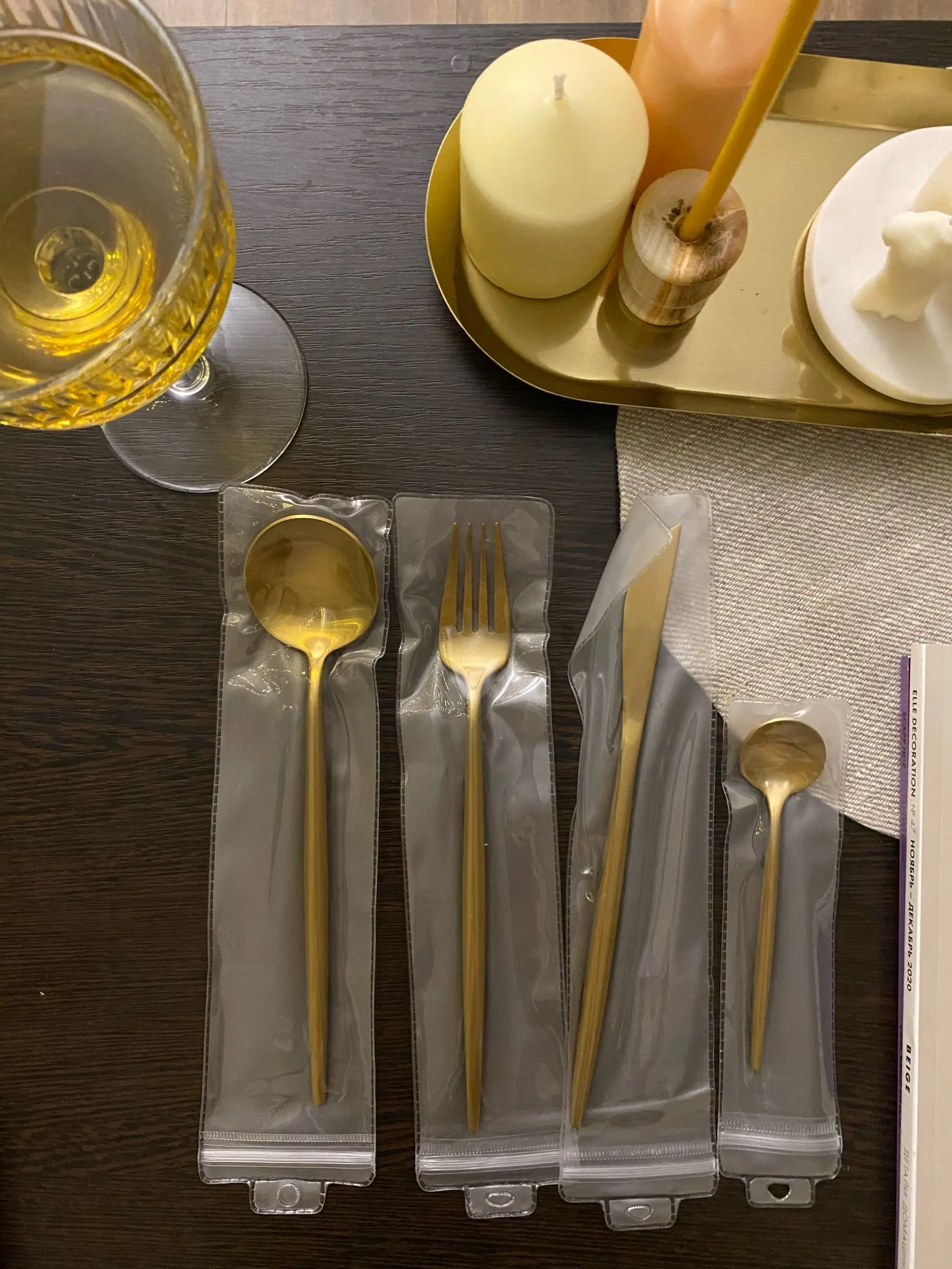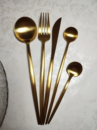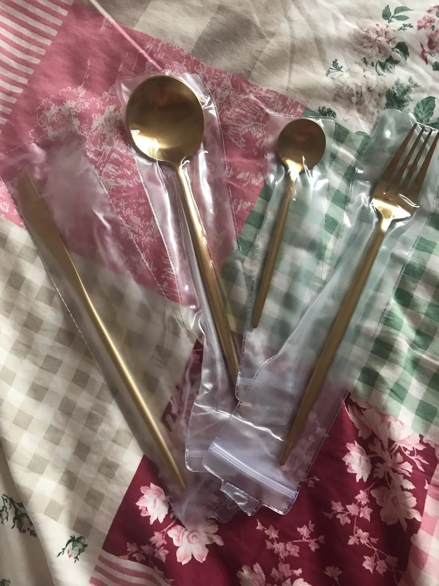 Товар хорошо упакован в отдельные закрывающиеся пакеты. Столовые приборы соответствуют описанию, матовые золотые, и они не очень легкие. Доволен!
