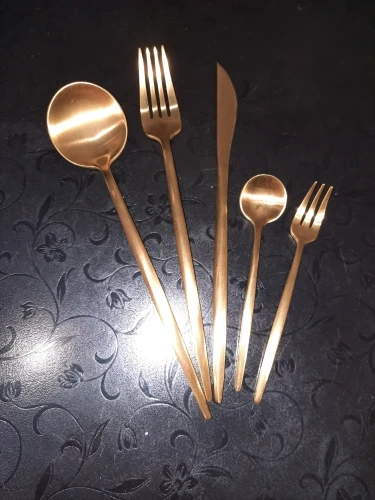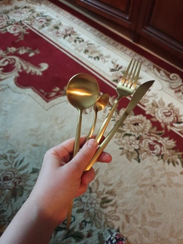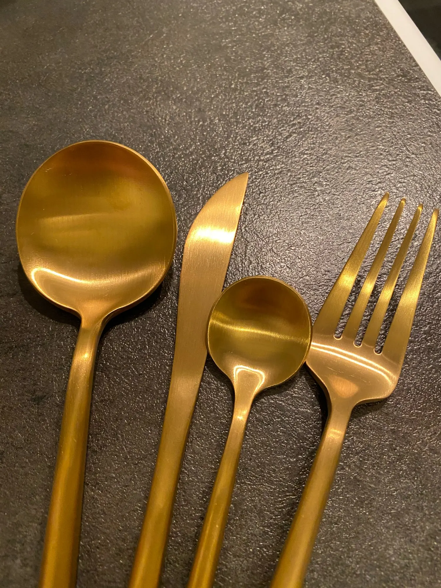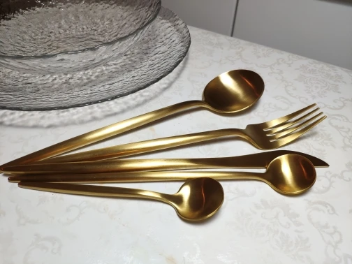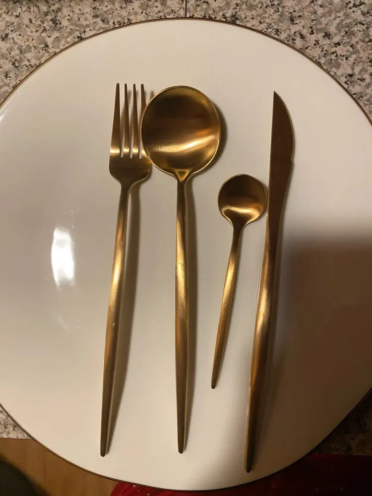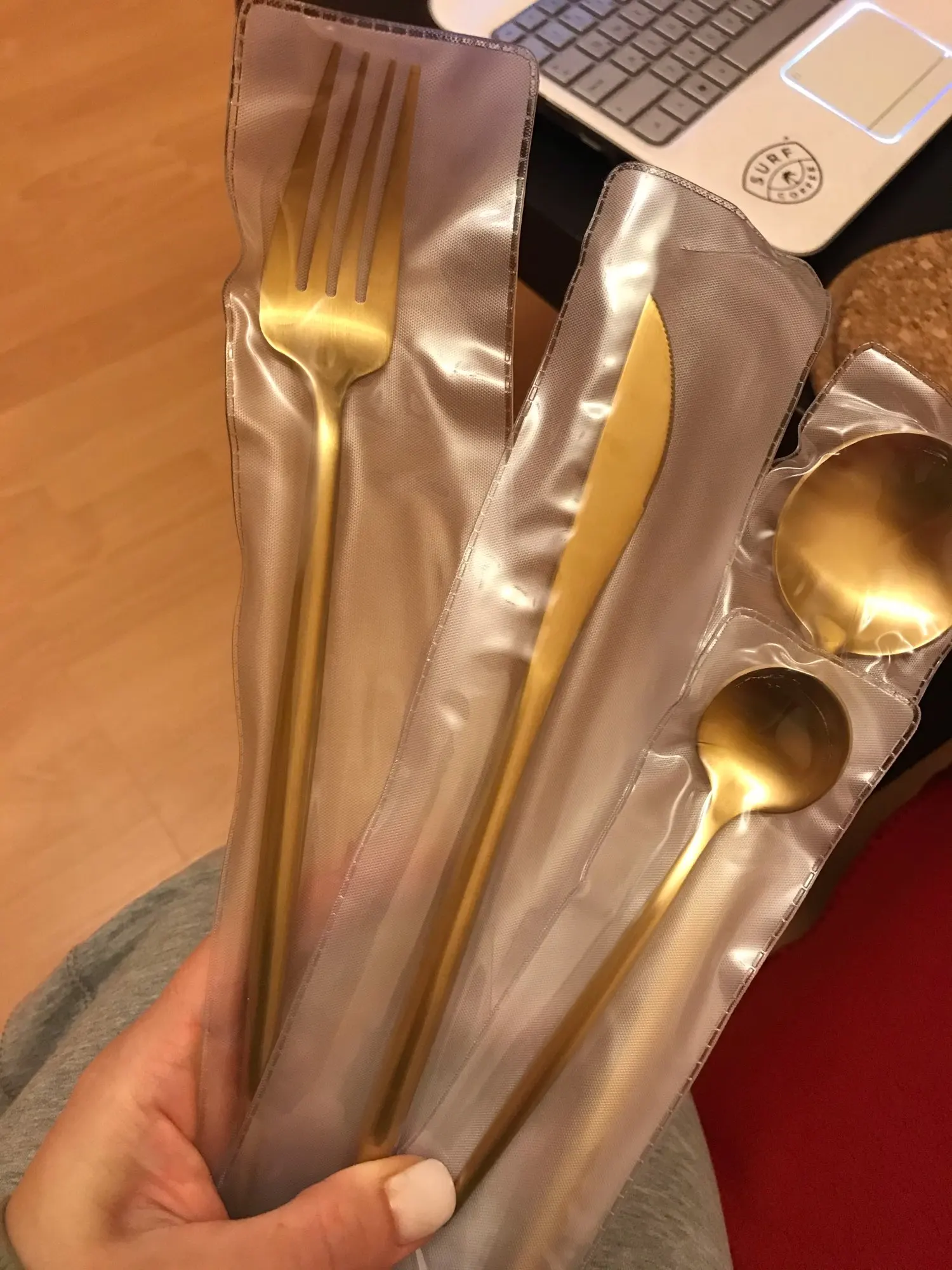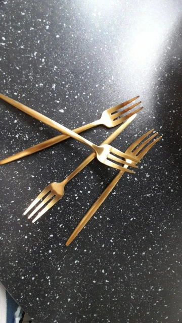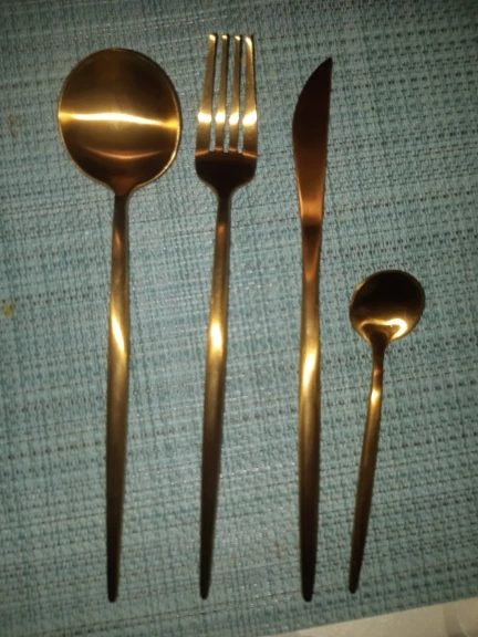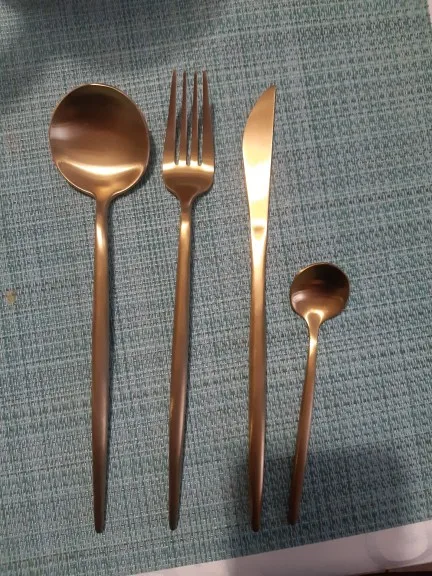 Ставлю 5 (дабы без них уходит вникуда отклик), но есть нюансы, по-моему мнению. Да, выглядит красиво, цвет приятный (матовое золото брала), не термоядерный желтый. Однако из-за толщины в 2 мм и острого прямоугольного края едальной части не могу назвать их "ох и ах", поскольку это некрасивая толщина и выдает дешевые приборы (см. фото 2). Также некоторые уже слегка коцаны, если всматриваться (см. фото 1), и есть подозрение, что в повседневной "носке" и мытье "все в кучу в раковину/ посудомойку" могут еще больше поцарапаться. Это все же покрытие: в царапках, присмотревшись, можно увидеть следы светлого металла. Так что у меня они на Вскр. обеды. И потом не понимаю, чего все ахаю от веса: качественные приборы не весят тонну, здесь он завышен, вполне могли подложить какого-нибудь свинца) Цену даже с учетом скидки (=430 р. за 4 шт.) считаю завышенной, а уж по-отдельности почти в 200р. за шт.и того. Заказывала 11.11 из РФ, в Екб пришло 17.11 обычной почтой.