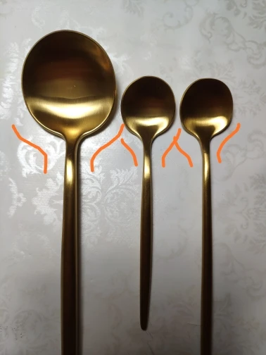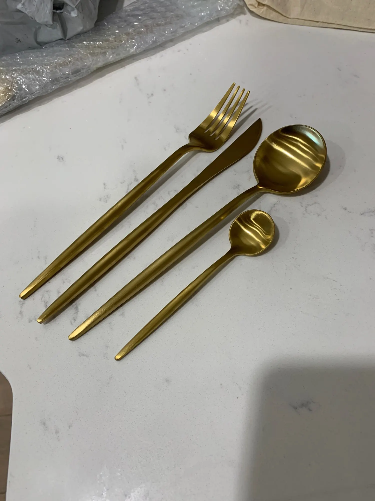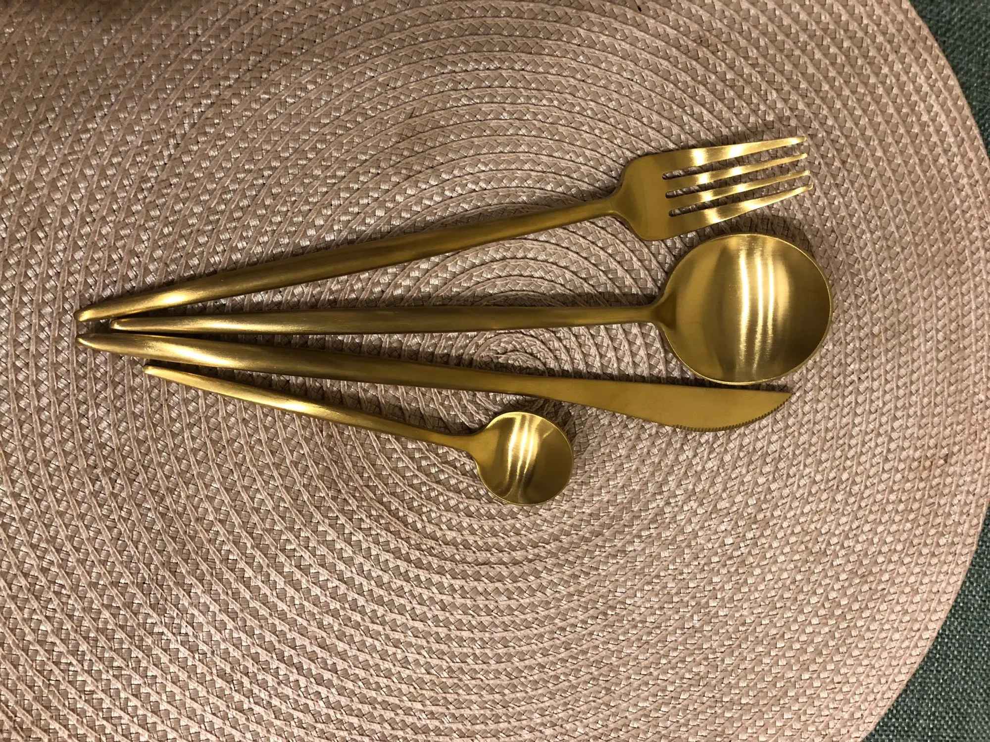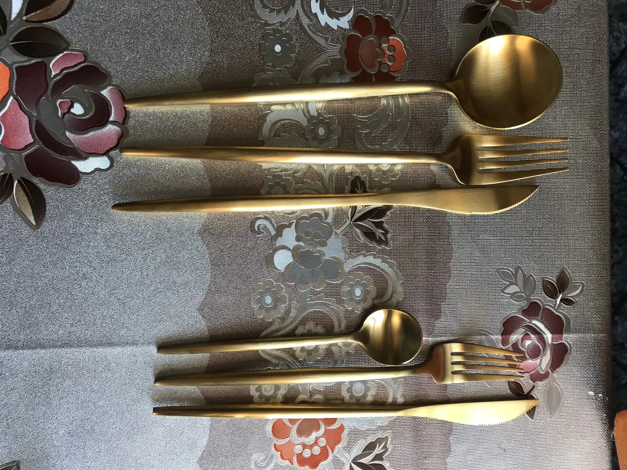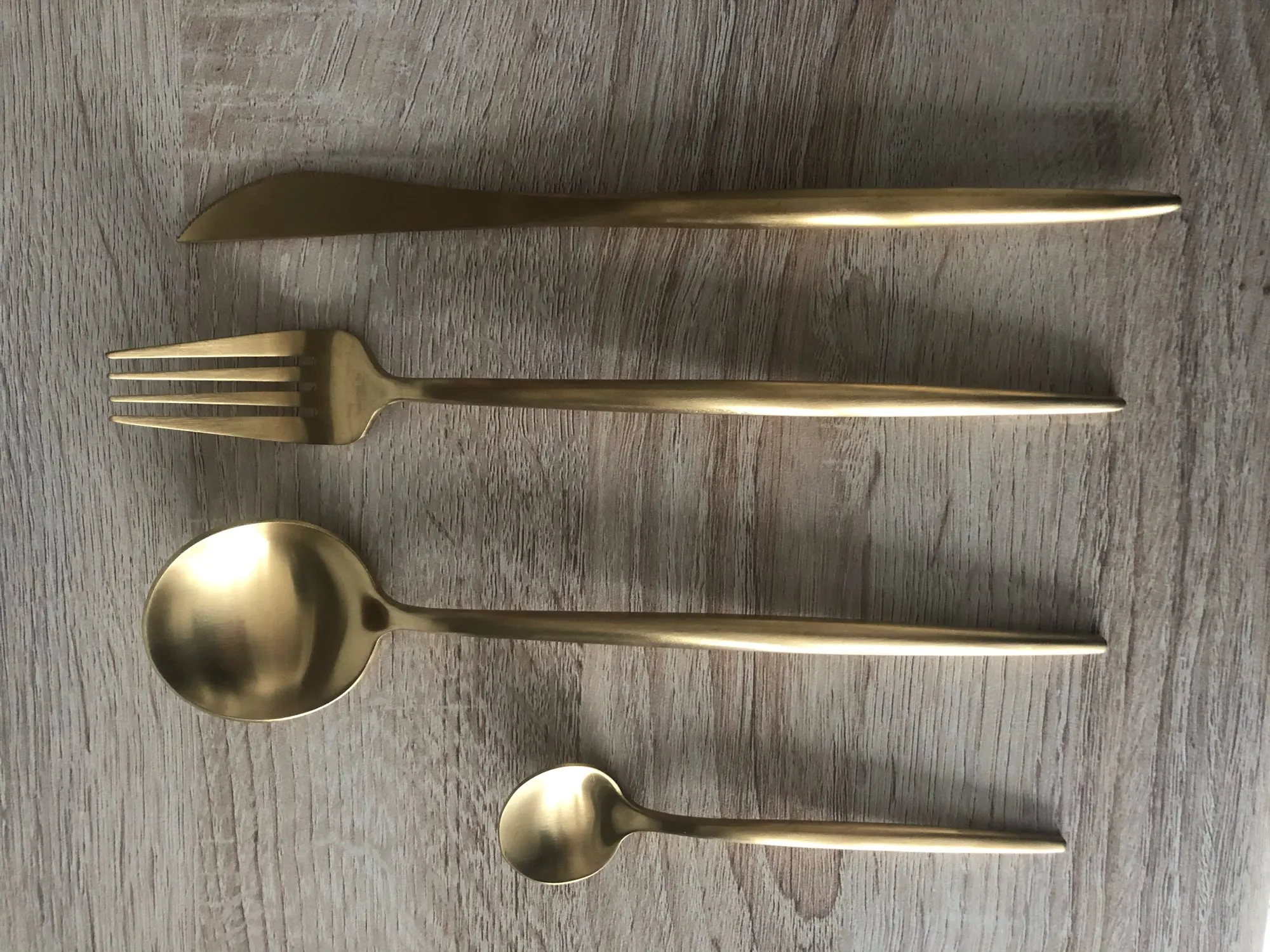 Ставлю 5 (дабы без них уходит вникуда отклик), но есть нюансы, по-моему мнению. Да, выглядит красиво, цвет приятный (матовое золото брала), не термоядерный желтый. Однако из-за толщины в 2 мм и острого прямоугольного края едальной части не могу назвать их "ох и ах", поскольку это некрасивая толщина и выдает дешевые приборы (см. фото 2). Также некоторые уже слегка коцаны, если всматриваться (см. фото 1), и есть подозрение, что в повседневной "носке" и мытье "все в кучу в раковину/ посудомойку" могут еще больше поцарапаться. Это все же покрытие: в царапках, присмотревшись, можно увидеть следы светлого металла. Так что у меня они на Вскр. обеды. И потом не понимаю, чего все ахаю от веса: качественные приборы не весят тонну, здесь он завышен, вполне могли подложить какого-нибудь свинца) Цену даже с учетом скидки (=430 р. за 4 шт.) считаю завышенной, а уж по-отдельности почти в 200р. за шт.и того. Заказывала 11.11 из РФ, в Екб пришло 17.11 обычной почтой.
