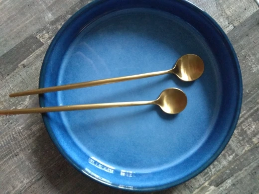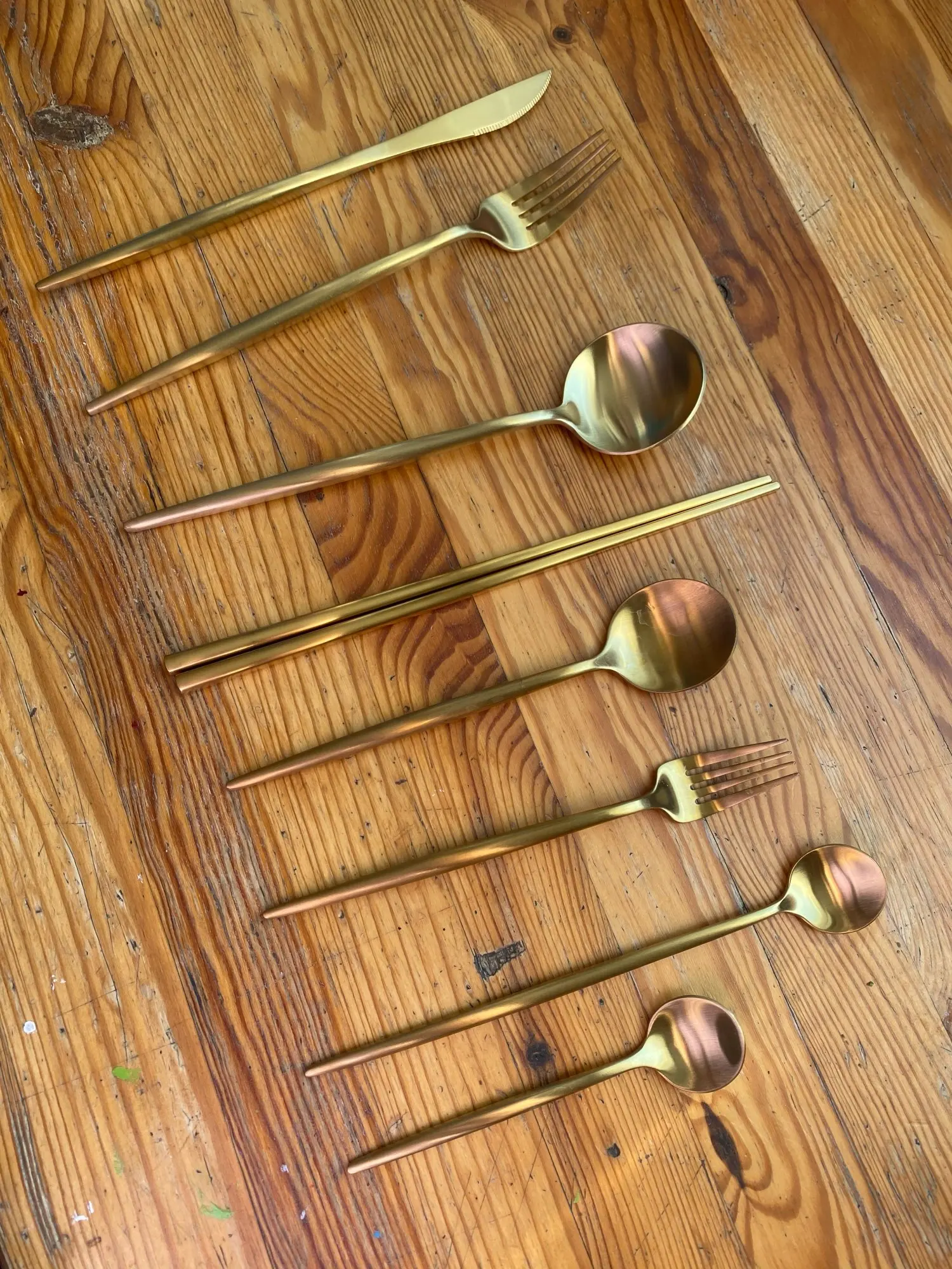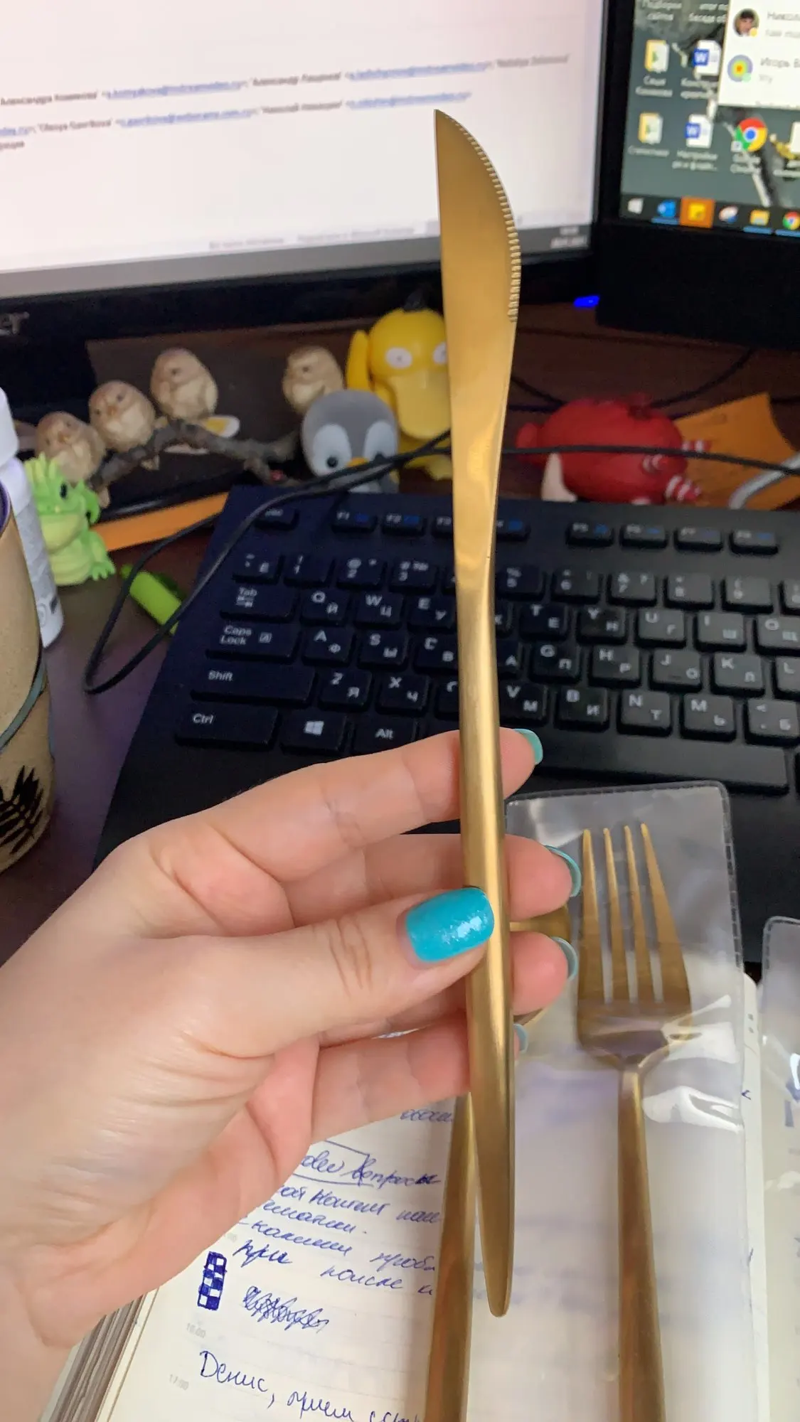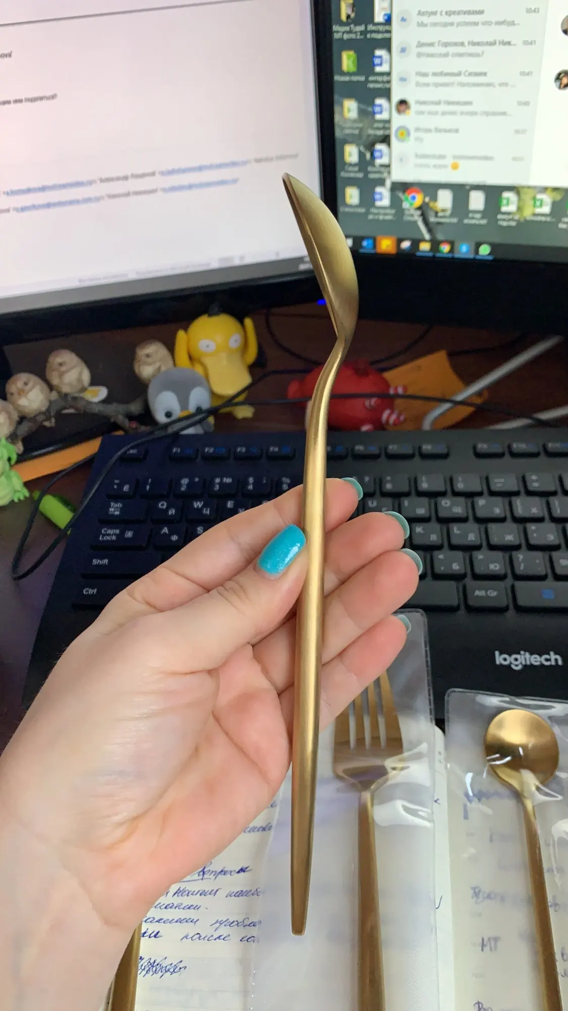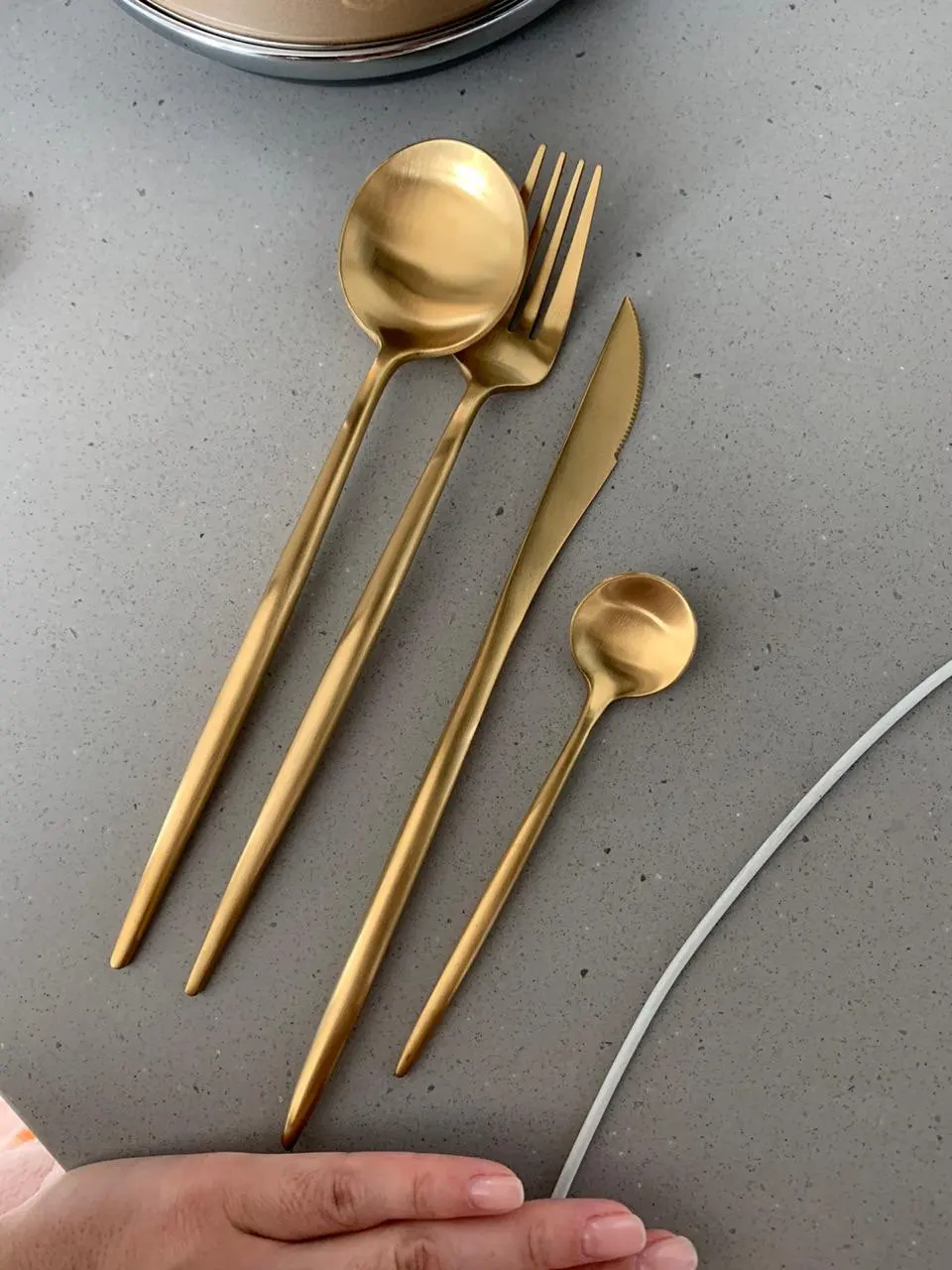 Ставлю 5 (дабы без них уходит вникуда отклик), но есть нюансы, по-моему мнению. Да, выглядит красиво, цвет приятный (матовое золото брала), не термоядерный желтый. Однако из-за толщины в 2 мм и острого прямоугольного края едальной части не могу назвать их "ох и ах", поскольку это некрасивая толщина и выдает дешевые приборы (см. фото 2). Также некоторые уже слегка коцаны, если всматриваться (см. фото 1), и есть подозрение, что в повседневной "носке" и мытье "все в кучу в раковину/ посудомойку" могут еще больше поцарапаться. Это все же покрытие: в царапках, присмотревшись, можно увидеть следы светлого металла. Так что у меня они на Вскр. обеды. И потом не понимаю, чего все ахаю от веса: качественные приборы не весят тонну, здесь он завышен, вполне могли подложить какого-нибудь свинца) Цену даже с учетом скидки (=430 р. за 4 шт.) считаю завышенной, а уж по-отдельности почти в 200р. за шт.и того. Заказывала 11.11 из РФ, в Екб пришло 17.11 обычной почтой.