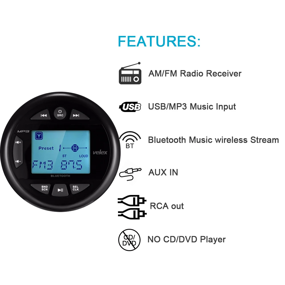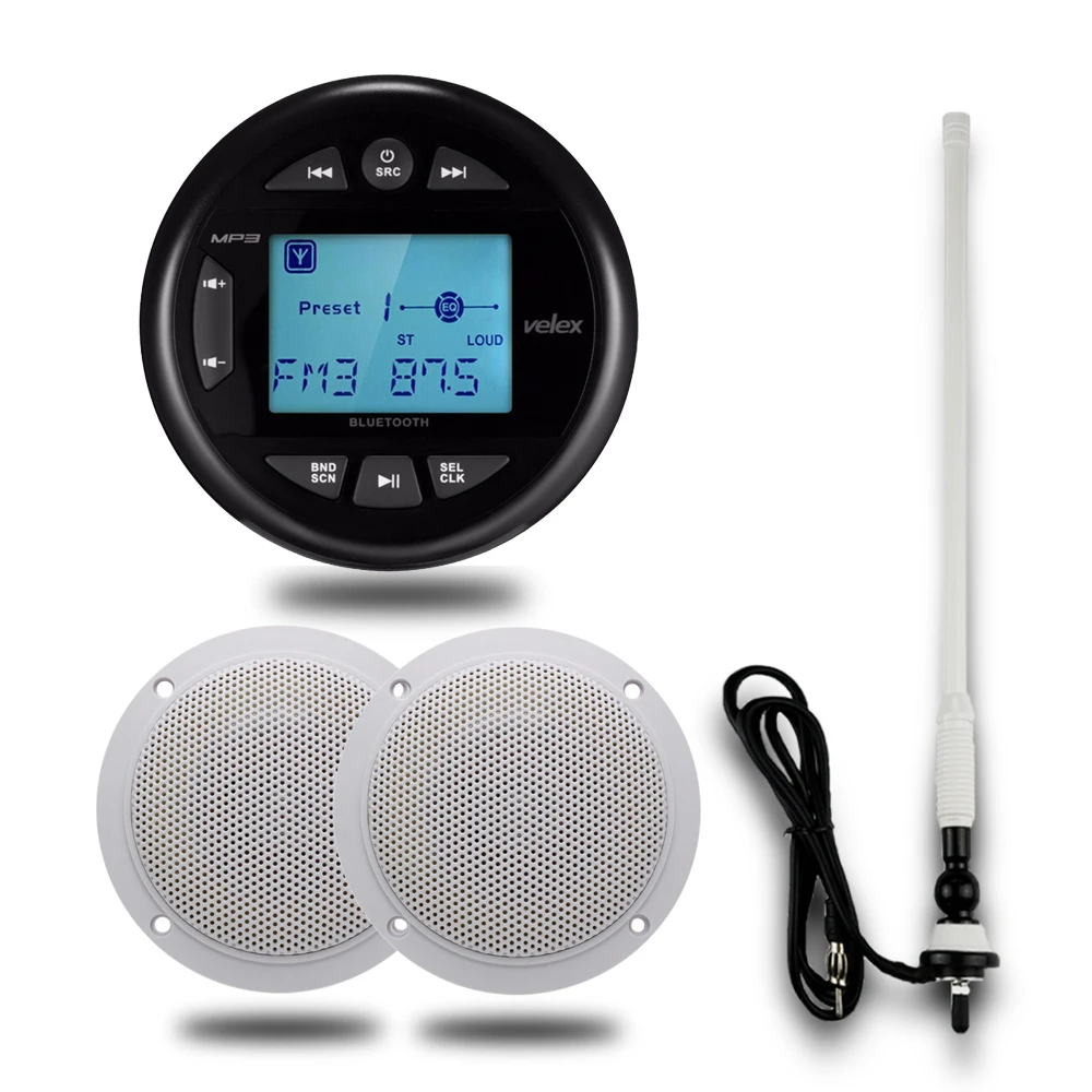 Управляйте волнами до мелодии ваших любимых цифровых носителей. Добавьте радиоприемник Velex Bluetooth Marine в корзину сегодня.