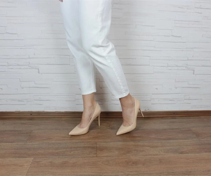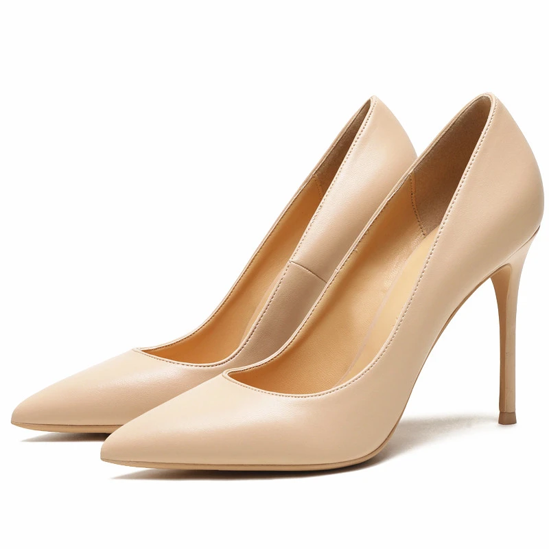 Туфли-лодочки женские из спилка, бежевые, на высоком каблуке 10 см, с острым носком, K-358