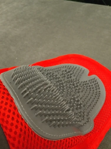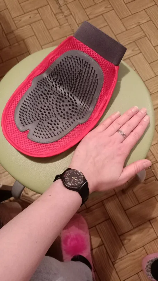 Для массажа очень хорошо. Шерсть вычесывает. но хуже чем металлическая. на руке болтается. Шерсть трудно смывается, второй раз не возьму.