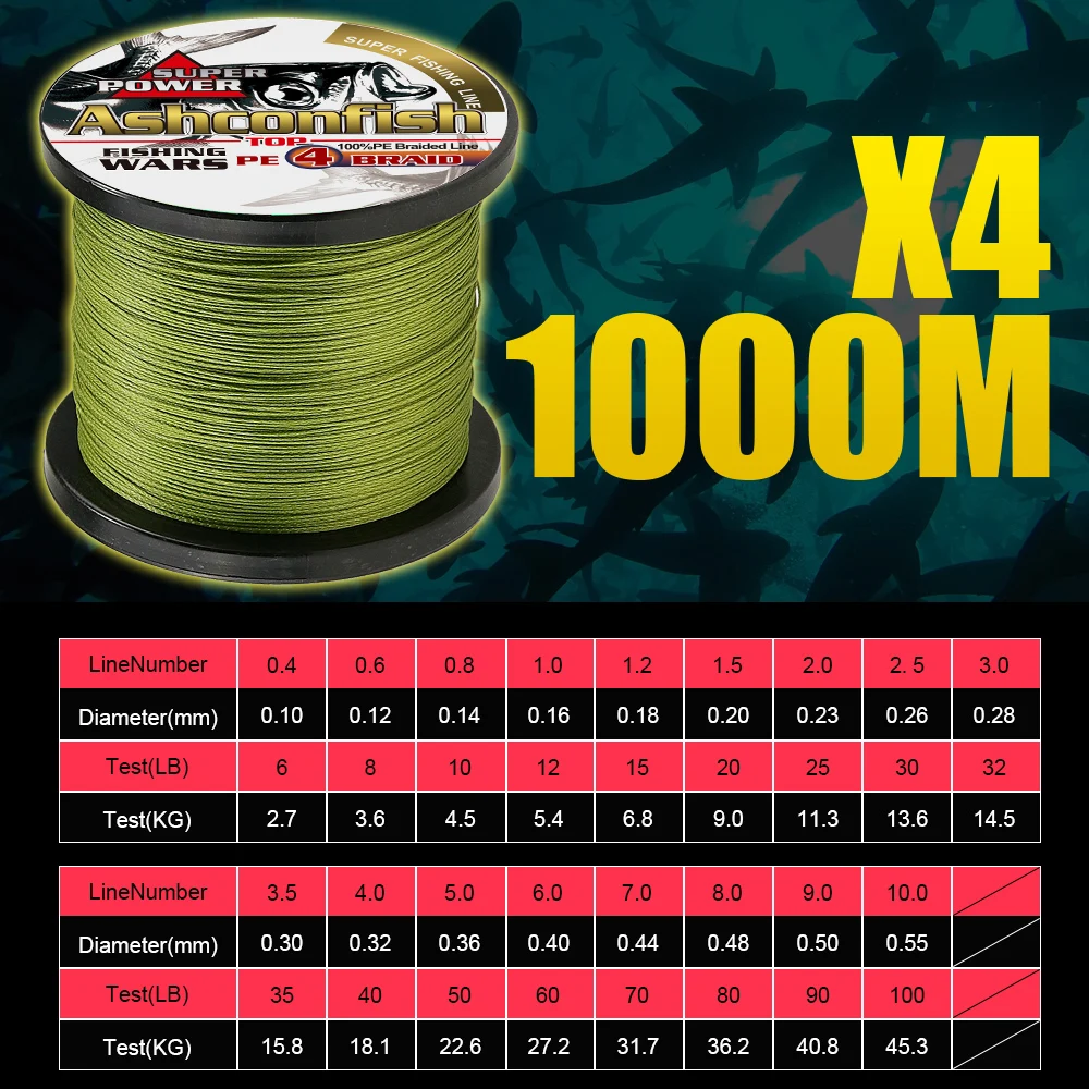Ashconish плетеная леска, 4 нити 500 м 1000 м, японская мультифиламентная тестовая плетеная проволока 6-100 фунтов, шнур pe для океанской, морской, ледовой рыбалки