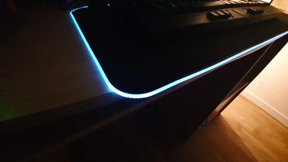 Всё как в описании. Режимов полсветки около 10. Коробка пришла мятая и подавленная. Коврик был скручен, и возможно небережно, так как в местах изгибов яркие полосы (возможно в момент перевозки повредилось из-за диформации коробки)