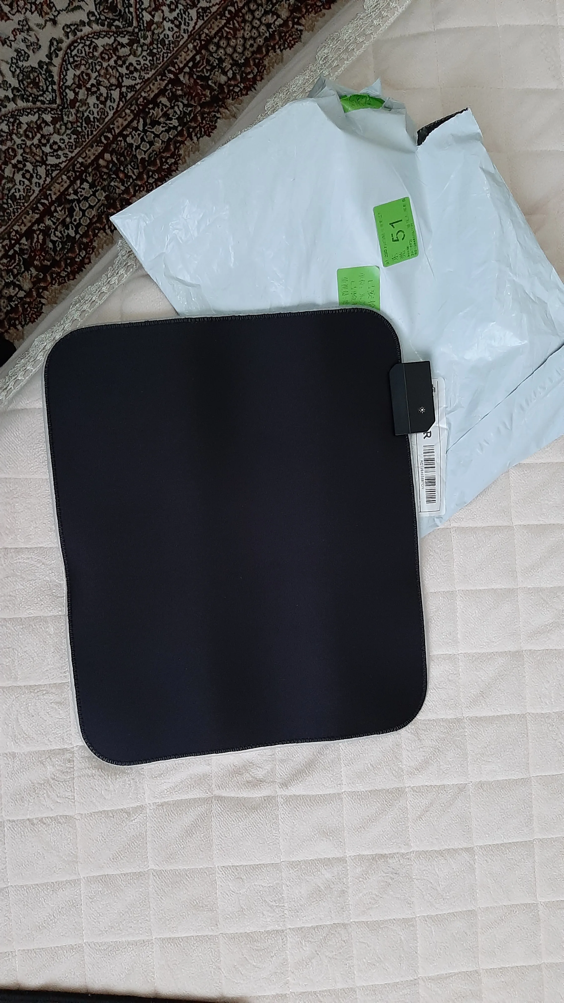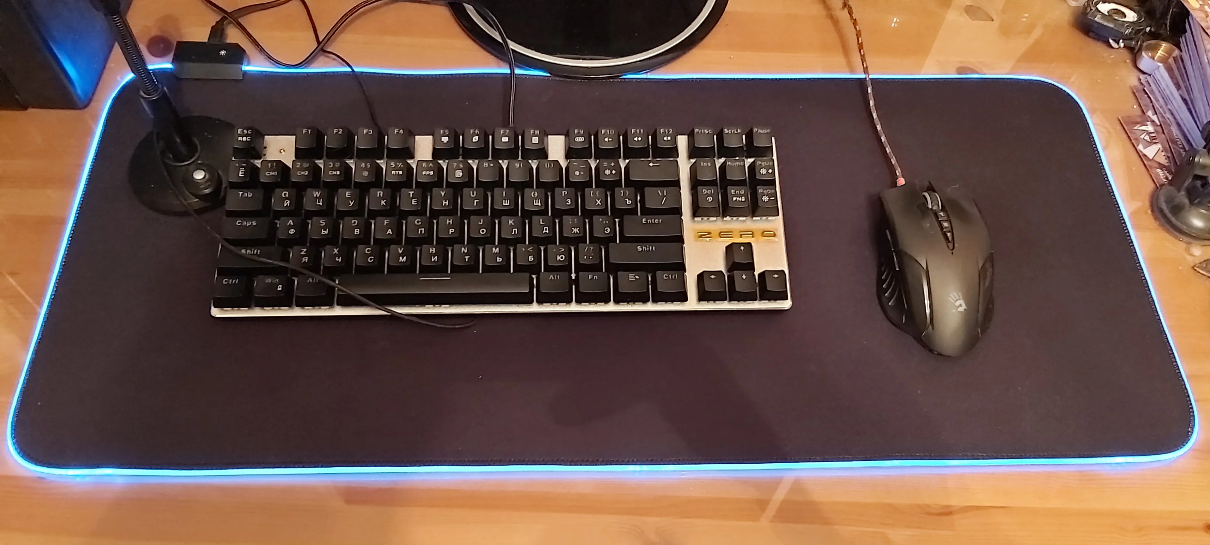 Приятный, мягкий, и большой. Подсветка чуть расстроила плавного перелива всех цветов не шибко много, хоть все цвета присутствуют за такую цену грех жаловаться брал я (RGB Black 300X800) очень большой вай. (ще расстроила коробка вся помятая ужас. "почта россии жет")