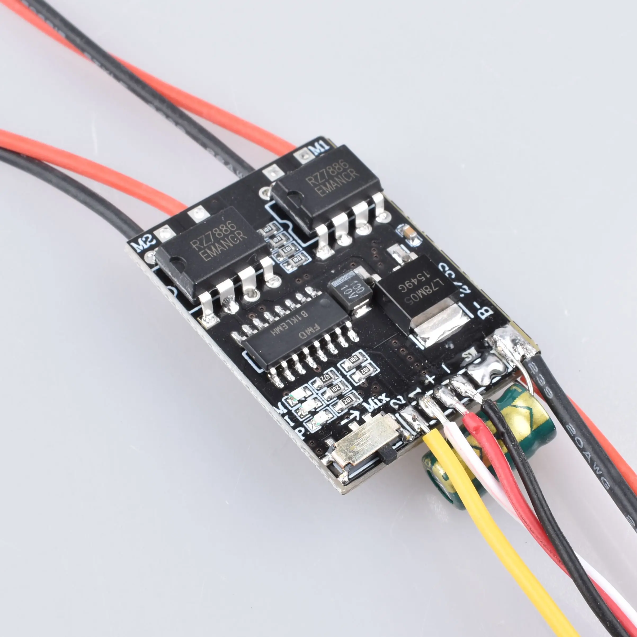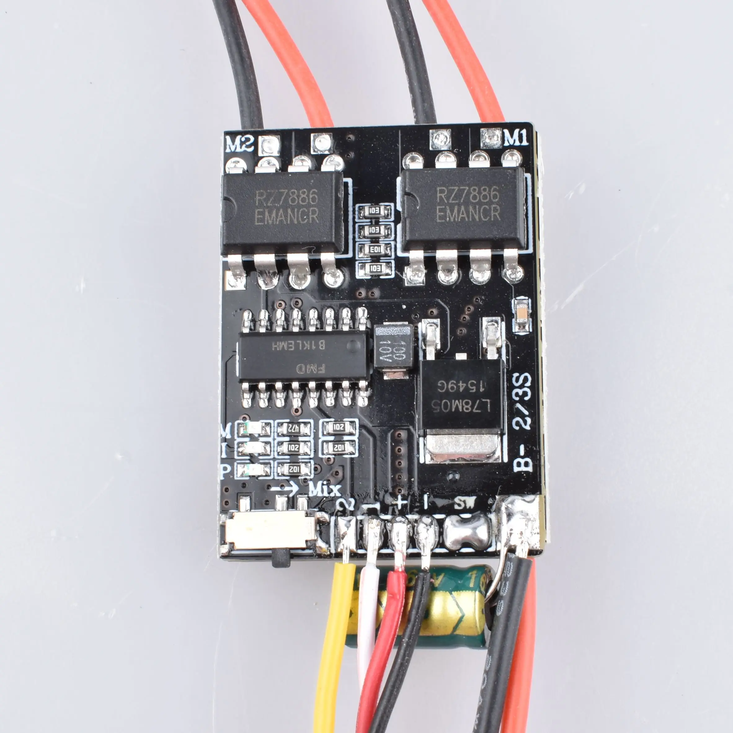 Заказал 4. Все 4 удобны. Протестировано на 8,4 вольт. Есть два режима. Два двигателя работают одновременно от 1 или 2 входных сигналов, вперед и назад. Или два двигателя, работающие отдельно от 2 различных каналов, также вперед и назад. Режим меняется с помощью переключателя на контроллере. Оба режима имеют пропорциональное управление (может идти быстрее или медленнее в соответствии с входным сигналом). В основном это 2 одномоторных одноканальных контроллера, комбинированных на одной плате. Хороший контроллер. Рекомендовано.