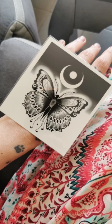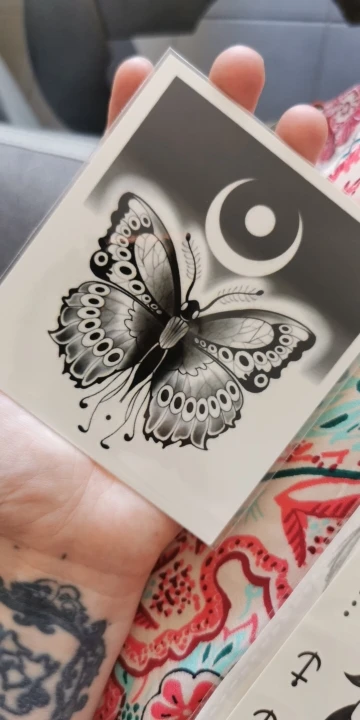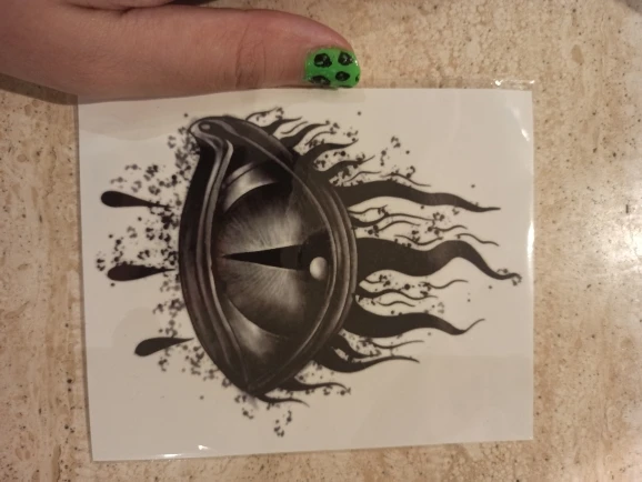 Тату такая же, как на фото. Налепить пока не пробовала, но выглядит очень красиво
