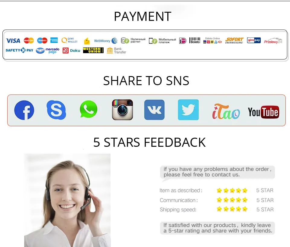 Доставка Все товары будут отправлены в течение 12-48 часов после того, как ваш платеж будет подтвержден. Примечание: товар будет отправлен по незарегистрированной почте, которую невозможно отследить. Но это придет к вам в течение 20-50 дней, то, пожалуйста, не волнуйтесь. Если посылка не получена в течение 60 дней, мы вышлем вам новый товар или вернем полную оплату к вам. Большое спасибо за ваше понимание. Отзывы Мы нацелены на обеспечение высокого качества с отличный сервис для вас. Если наши товары и услуги удовлетворяют, то, пожалуйста, оставьте 5-звездочный положительный комментарий, который будет стимулировать нас, чтобы двигаться вперед и обеспечить лучшее обслуживание. В том случае, если вы имеете какие-либо проблемы, то, пожалуйста, не стесняйтесь при помощи обратного осмоса, свяжитесь с нами, мы сделаем все возможное, чтобы решить любые проблемы. Кроме того, купона может быть полученный товар в том случае, если вы оставите красивую картину продукта. Информация о возврате товара Каждый товар проверяется перед отправкой. Только в том случае, если вы не довольны товаром, вы можете товар, который вы получили, пожалуйста, свяжитесь с нами. Все сообщения будут даны ответы в течение 2 рабочих дней. Если вы хотите вернуть посылку, пожалуйста, отправить его к нам в течение 30 дней в первоначальном состоянии, которого доставку должны быть оплачены вами. Тогда ваша оплата будет возвращена после того, как возвращенный товар прибыл на нашем складе.