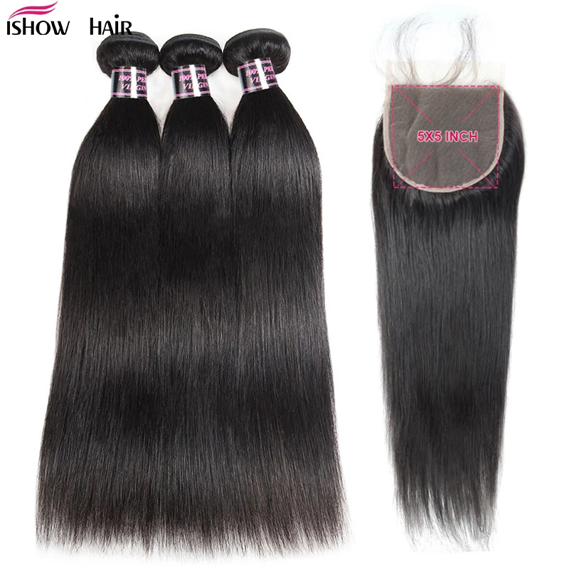 Ishow бразильские прямые пучки волос с застежкой 5X5 Закрытие с 3 пряди волос 100% человеческие пучки волос с застежкой не Реми
