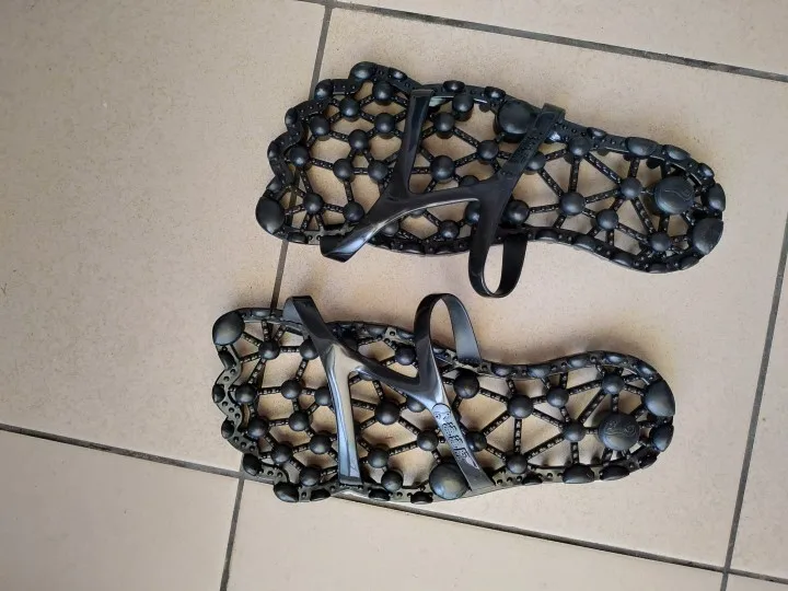 Ходити в них неможливо. Запах сильний. Але дійсно, наче каміннями йду морським дном. Вчитимусь ходити потроху в них. А ще виглядає наче дуже тонкі лямки. Напишу коли що зміниться. Досить швидко отримала на пошті в пакетику. За 17 днів.