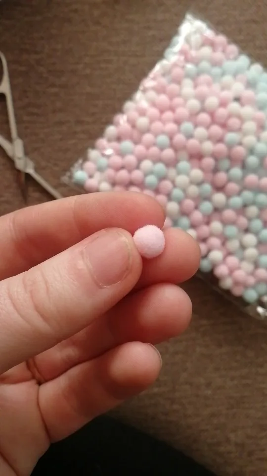 Помпончики прикольные, брала разноцветные, чтобы посмотреть, какие лучше выглядят. Так и не поняла, каким образом они так крепко держат форму: если разрезать их, то они разваливаются на мелкие ниточки. Рекомендую попробовать вам самим: такого я не ожидала)))