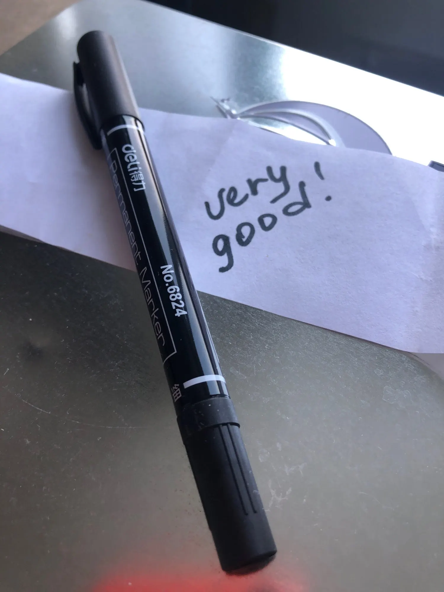 как маркер идеален, пишет на практически любых поверхностях, но я брала рисования и он не подходит, слишком жирно рисует даже тонкий кончик (на рисунке видно, надпись толстым концом маркера) доставлено быстро в сборной посылке