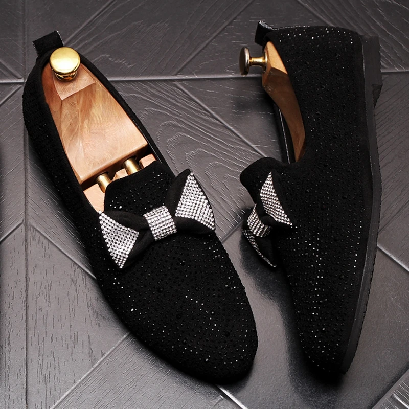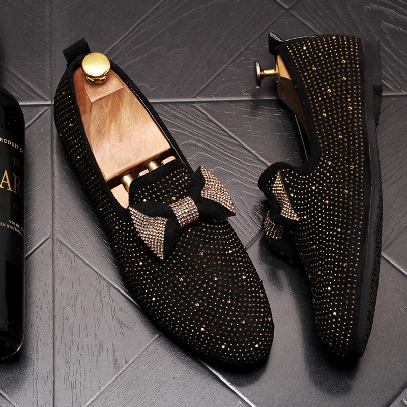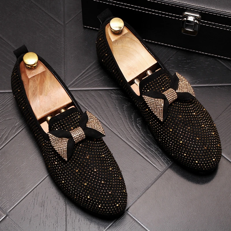 CuddlyIIPandaРоскошные Дизайнерские мужские повседневные лоферы с бантом-бабочкой; Мужские слипоны со стразами; Свадебная обувь