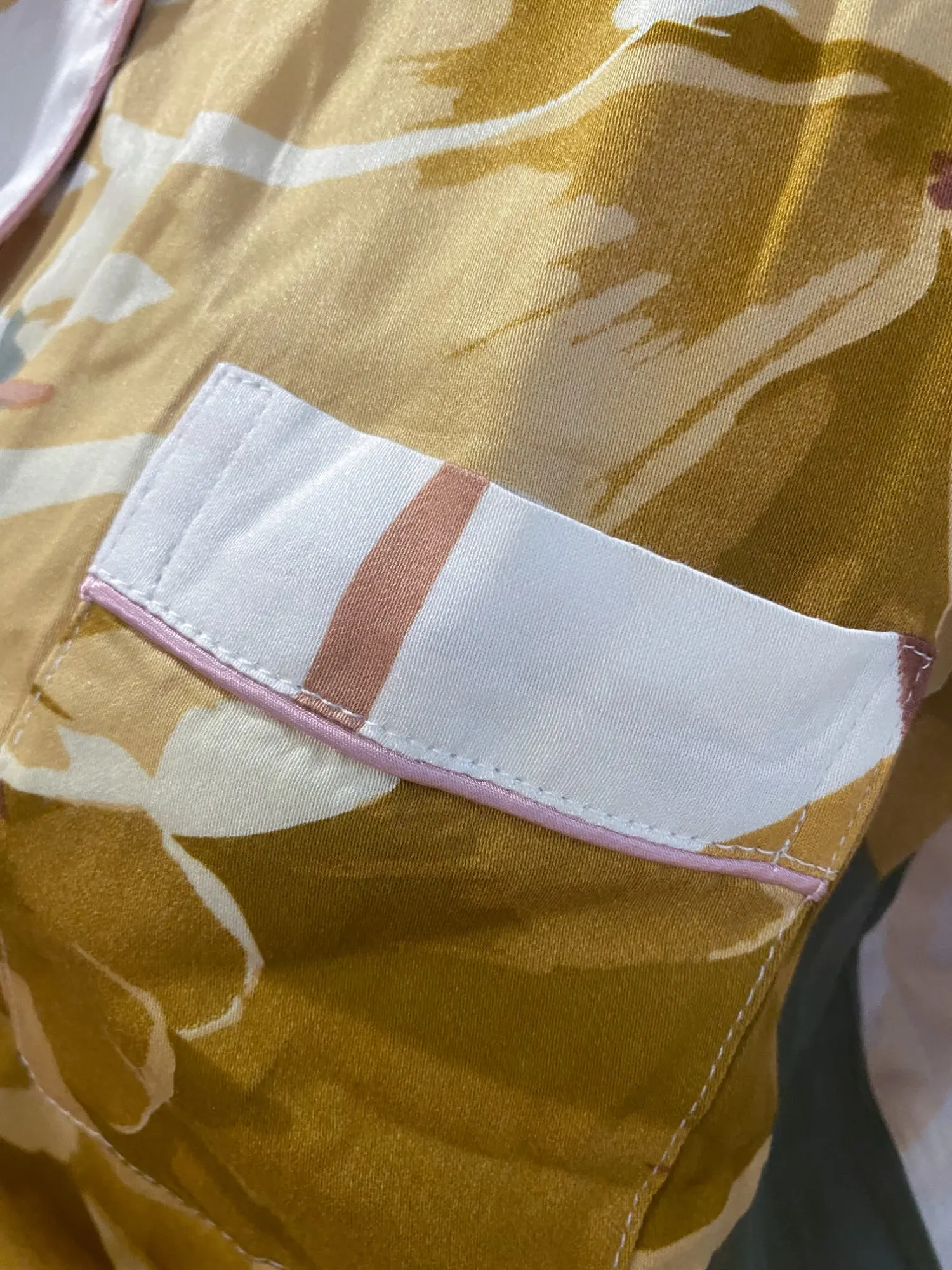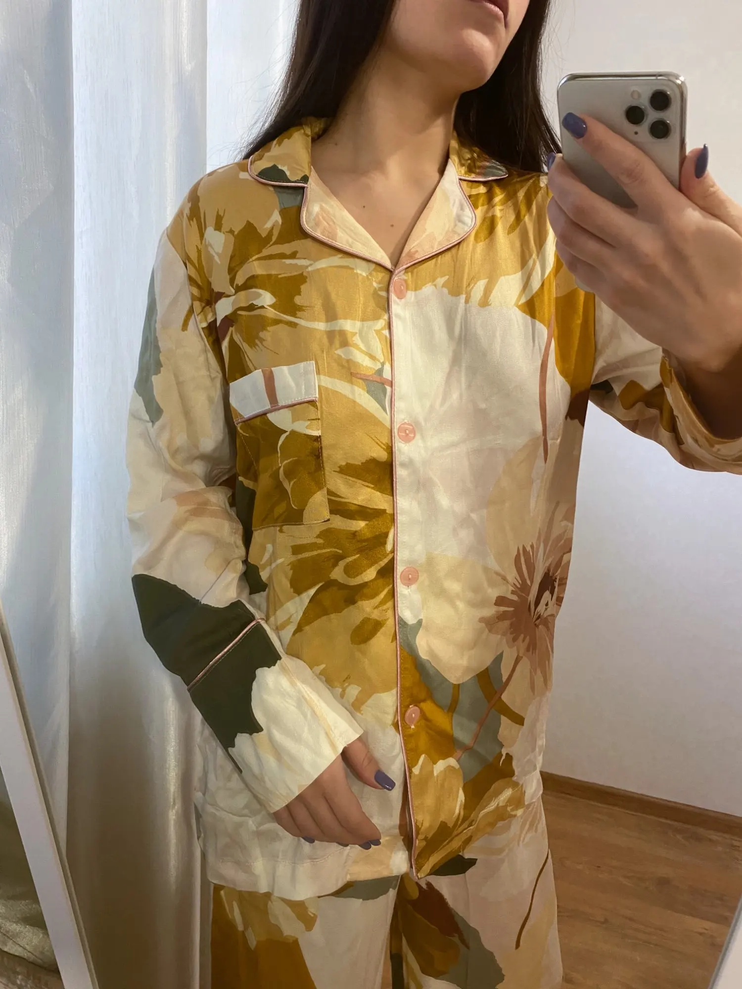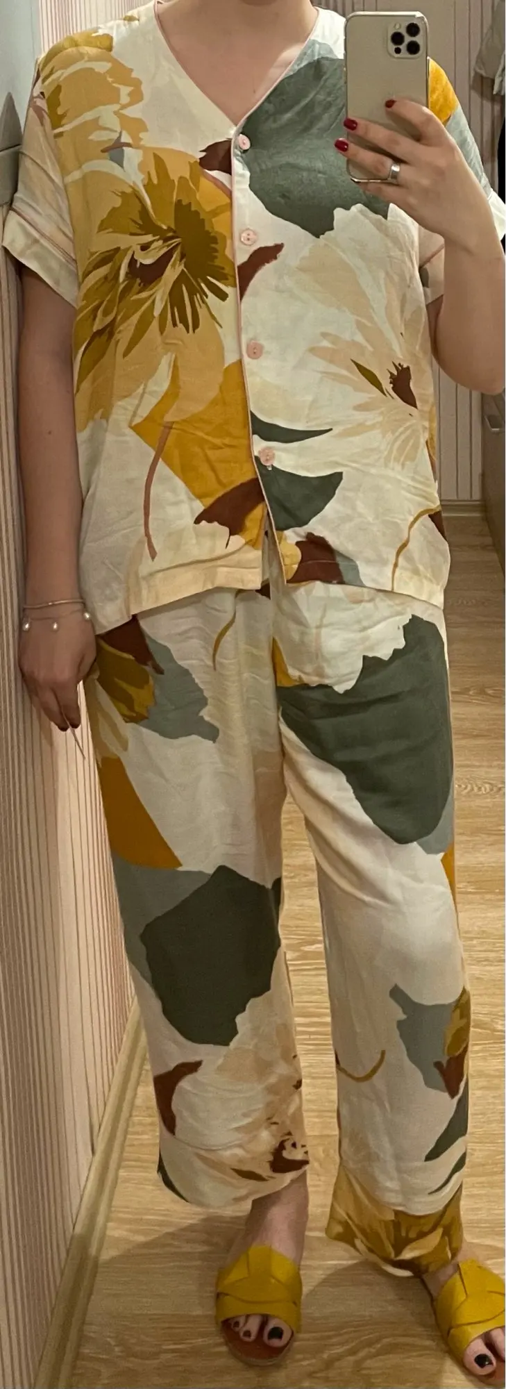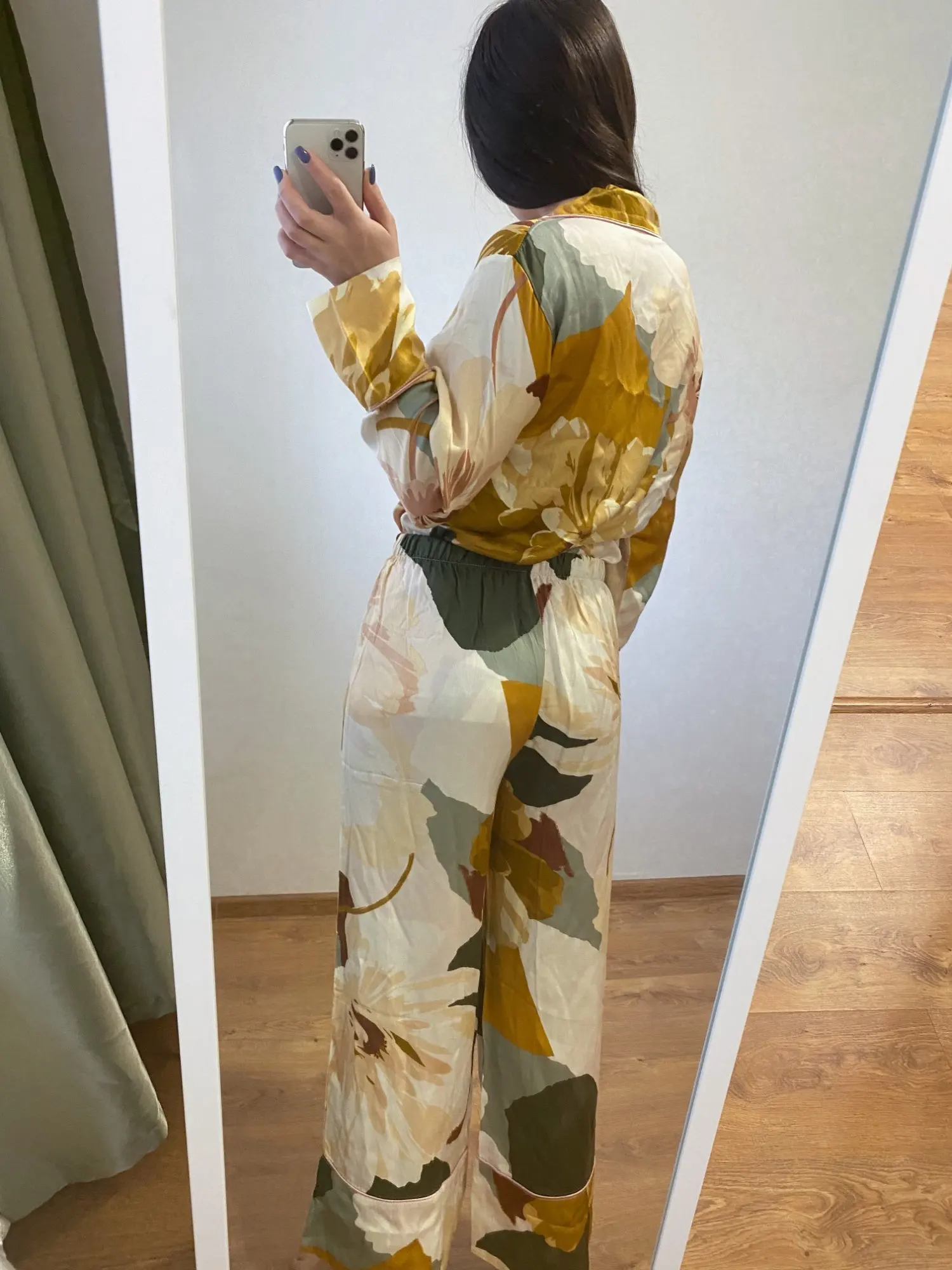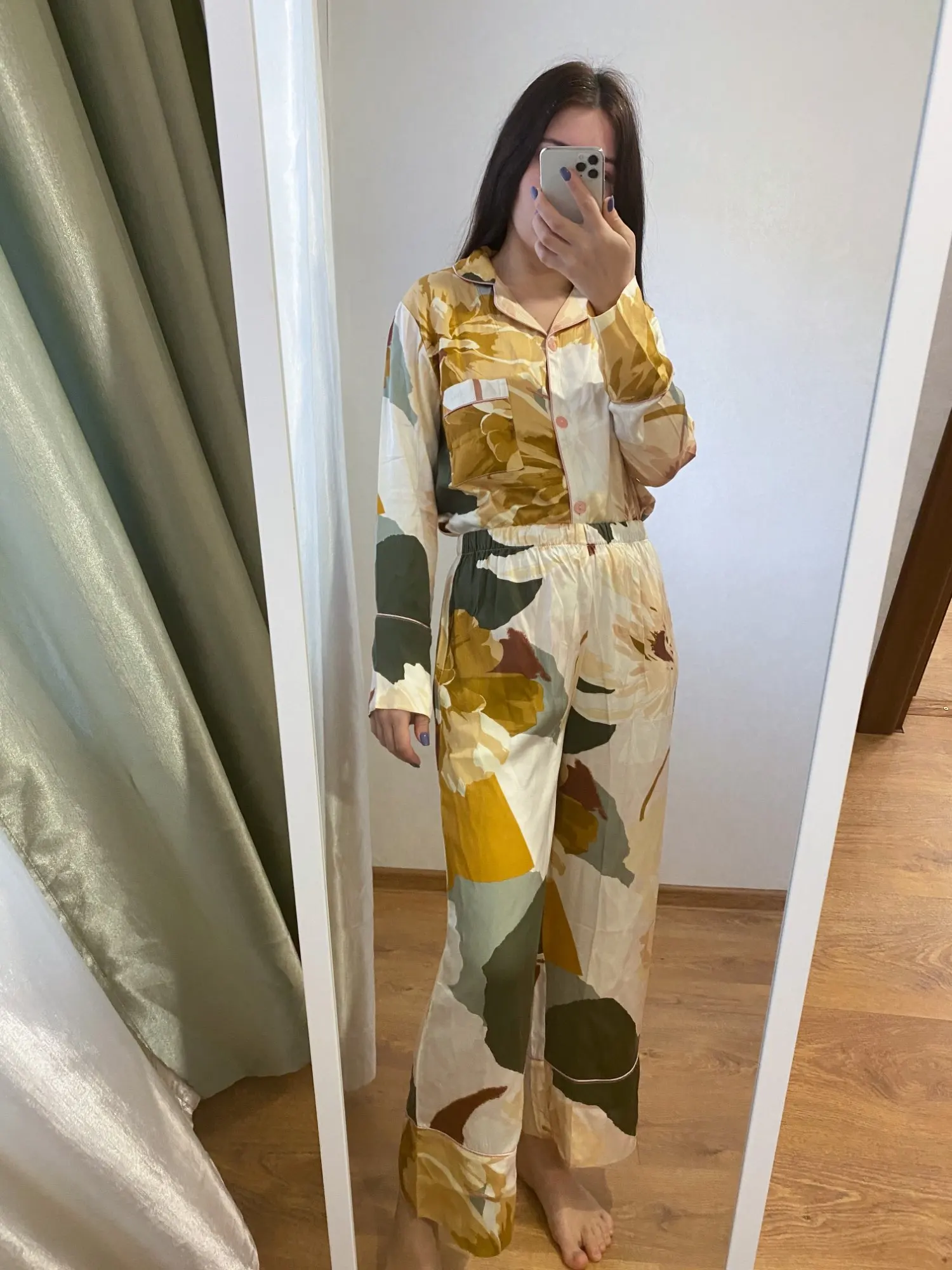 Идеальная пижама, как в O*sho. Состав вискоза, ткань мягкая, струящаяся, комфортная к телу. Мне очень понравился растительный принт и цвета. По фасону свободная, полная длина рукава у рубашки. На рост рост 161 длина брюк до середины щиколотки.