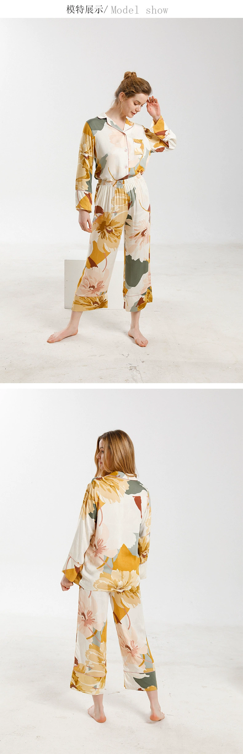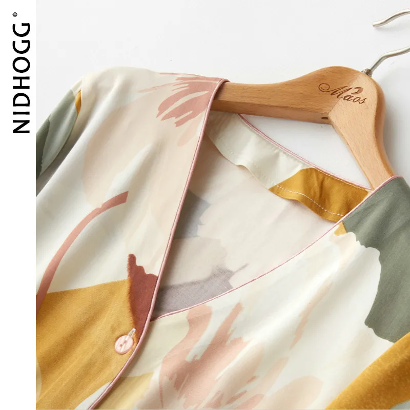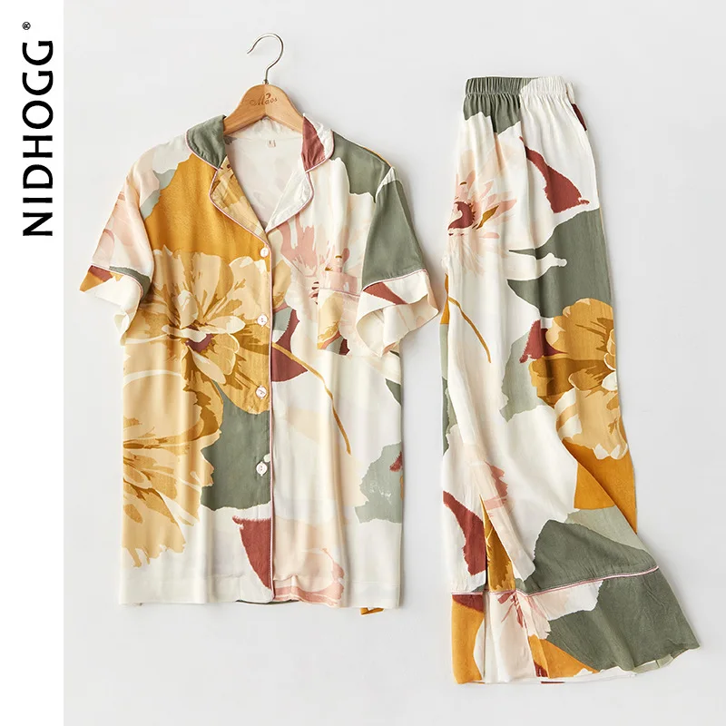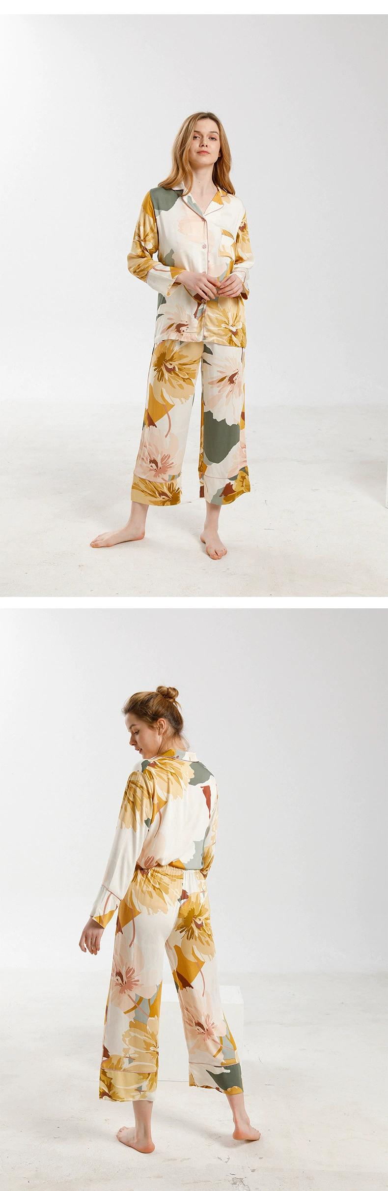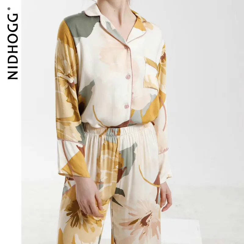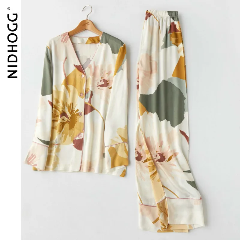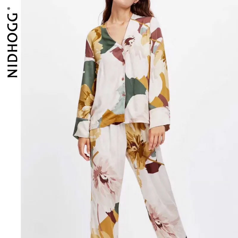 Новый Атласный пижамный комплект с цветочным принтом, модные пижамы с длинным рукавом, женский домашний комплект одежды для сна с V-образным вырезом, 2 шт., 2020