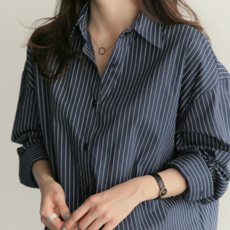 Полосатая рубашка средней длины, женская одежда для весны и осени 2019, дикая Свободная Повседневная рубашка в Вертикальную Полоску большого размера с длинными рукавами